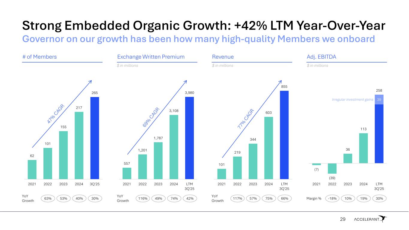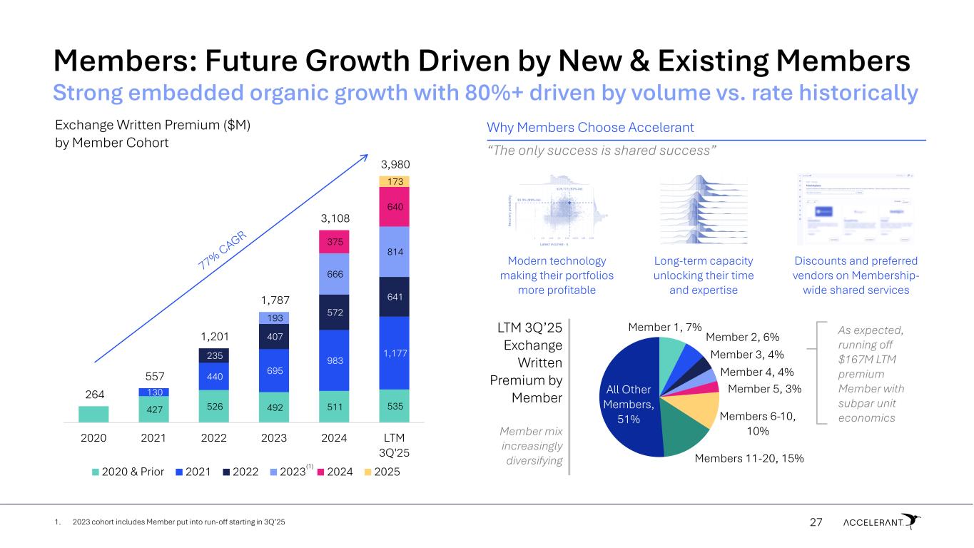 427 526 492 511 535 130 440 695 983 1,177235 407 572 641 193 666 814 375 640 173 264 557 1,201 1,787 3,108 3,980 2020 2021 2022 2023 2024 LTM 3Q'25 Exchange Written Premium ($M) by Member Cohort 2020 & Prior 2021 2022 2023 2024 2025 27 Members: Future Growth Driven by New & Existing Members Member 1, 7% Member 2, 6% Member 3, 4% Member 4, 4% Member 5, 3% Members 6-10, 10% Members 11-20, 15% All Other Members, 51% LTM 3Q’25 Exchange Written Premium by Member Member mix increasingly diversifying As expected, running off $167M LTM premium Member with subpar unit economics Why Members Choose Accelerant “The only success is shared success” Modern technology making their portfolios more profitable Long-term capacity unlocking their time and expertise Discounts and preferred vendors on Membership- wide shared services (1) 1. 2023 cohort includes Member put into run-off starting in 3Q’25 Strong embedded organic growth with 80%+ driven by volume vs. rate historically