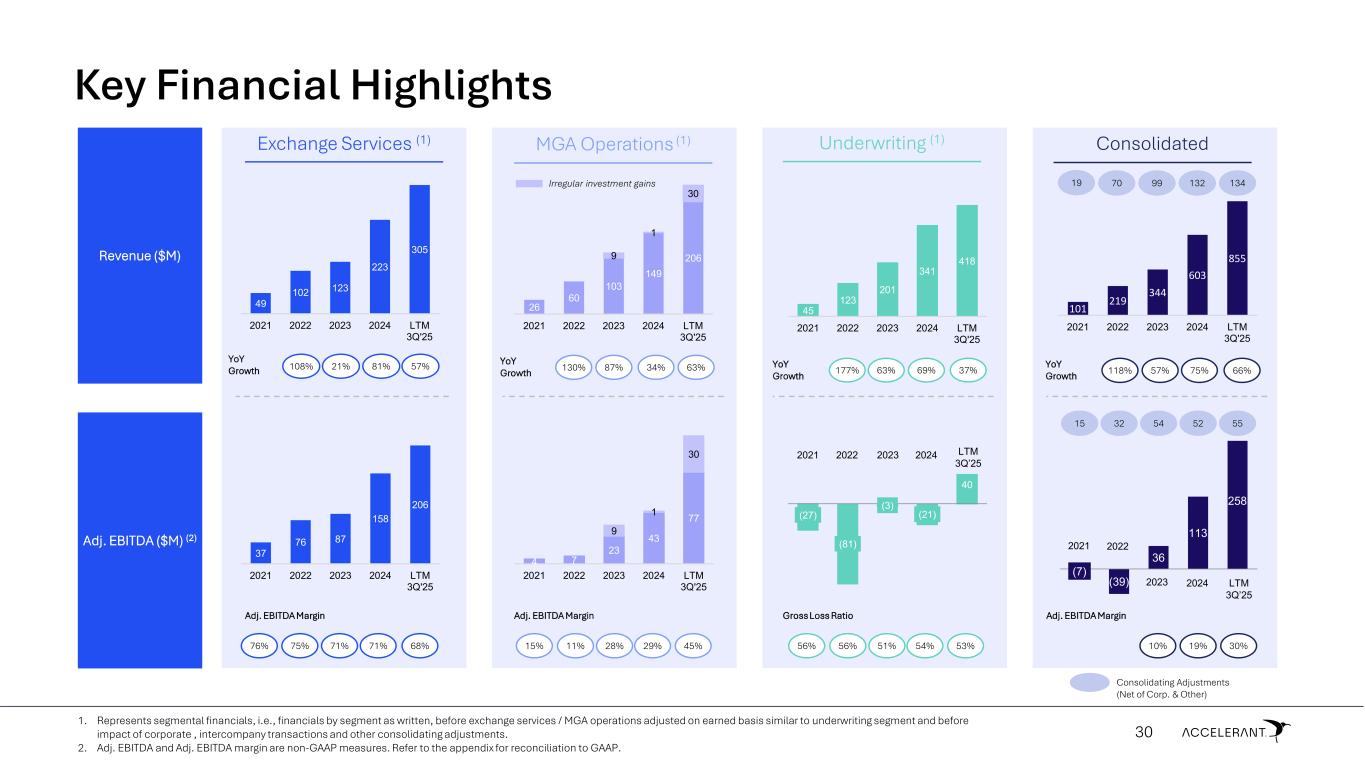 (7) (39) 36 113 258 26 60 103 149 2069 1 30 2021 2022 2023 2024 LTM 3Q'25 49 102 123 223 305 2021 2022 2023 2024 LTM 3Q'25 30 Key Financial Highlights Consolidating Adjustments (Net of Corp. & Other) 1. Represents segmental financials, i.e., financials by segment as written, before exchange services / MGA operations adjusted on earned basis similar to underwriting segment and before impact of corporate , intercompany transactions and other consolidating adjustments. 2. Adj. EBITDA and Adj. EBITDA margin are non-GAAP measures. Refer to the appendix for reconciliation to GAAP. Adj. EBITDA ($M) (2) Revenue ($M) Adj. EBITDA Margin Adj. EBITDA Margin 70 9919 132 543215 52 Adj. EBITDA Margin Exchange Services (1) ConsolidatedMGA Operations (1) Underwriting (1) 2021 2022 2023 2024 YoY Growth 108% 21% 75% 71%76% 81% 71% 118% 57% 19% 75%YoY Growth 10% 130% 87% 11% 28%15% 34%YoY Growth 29% 177% 63% 69%YoY Growth 2021 2022 2023 2024 68% 45% LTM 3Q’25 134 LTM 3Q’25 30% 55 66% Gross Loss Ratio 56% 51%56% 54% 53% 57% 63% 37% Irregular investment gains 45 123 201 341 418 2021 2022 2023 2024 LTM 3Q'25 101 219 344 603 855 2021 2022 2023 2024 LTM 3Q'25 37 76 87 158 206 2021 2022 2023 2024 LTM 3Q'25 4 7 23 43 77 9 1 30 2021 2022 2023 2024 LTM 3Q'25 (27) (81) (3) (21) 40