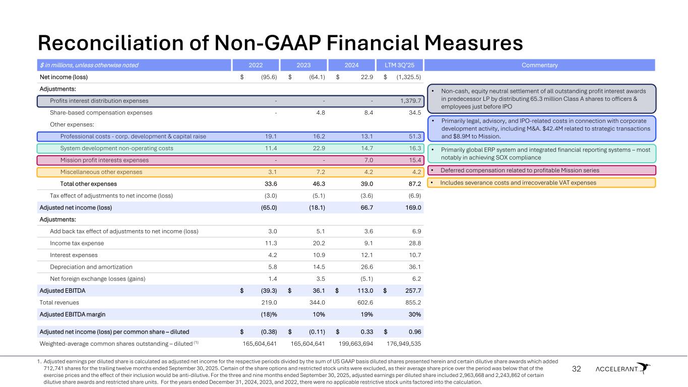 32 Reconciliation of Non-GAAP Financial Measures $ in millions, unless otherwise noted 2022 2023 2024 LTM 3Q’25 Commentary Net income (loss) $ (95.6) $ (64.1) $ 22.9 $ (1,325.5) Adjustments: Profits interest distribution expenses - - - 1,379.7 Share-based compensation expenses - 4.8 8.4 34.5 Other expenses: Professional costs - corp. development & capital raise 19.1 16.2 13.1 51.3 System development non-operating costs 11.4 22.9 14.7 16.3 Mission profit interests expenses - - 7.0 15.4 Miscellaneous other expenses 3.1 7.2 4.2 4.2 Total other expenses 33.6 46.3 39.0 87.2 Tax effect of adjustments to net income (loss) (3.0) (5.1) (3.6) (6.9) Adjusted net income (loss) (65.0) (18.1) 66.7 169.0 Adjustments: Add back tax effect of adjustments to net income (loss) 3.0 5.1 3.6 6.9 Income tax expense 11.3 20.2 9.1 28.8 Interest expenses 4.2 10.9 12.1 10.7 Depreciation and amortization 5.8 14.5 26.6 36.1 Net foreign exchange losses (gains) 1.4 3.5 (5.1) 6.2 Adjusted EBITDA $ (39.3) $ 36.1 $ 113.0 $ 257.7 Total revenues 219.0 344.0 602.6 855.2 Adjusted EBITDA margin (18)% 10% 19% 30% Adjusted net income (loss) per common share – diluted $ (0.38) $ (0.11) $ 0.33 $ 0.96 Weighted-average common shares outstanding – diluted (1) 165,604,641 165,604,641 199,663,694 176,949,535 • Non-cash, equity neutral settlement of all outstanding profit interest awards in predecessor LP by distributing 65.3 million Class A shares to officers & employees just before IPO • Primarily legal, advisory, and IPO-related costs in connection with corporate development activity, including M&A. $42.4M related to strategic transactions and $8.9M to Mission. • Primarily global ERP system and integrated financial reporting systems – most notably in achieving SOX compliance • Deferred compensation related to profitable Mission series • Includes severance costs and irrecoverable VAT expenses 1. Adjusted earnings per diluted share is calculated as adjusted net income for the respective periods divided by the sum of US GAAP basis diluted shares presented herein and certain dilutive share awards which added 712,741 shares for the trailing twelve months ended September 30, 2025. Certain of the share options and restricted stock units were excluded, as their average share price over the period was below that of the exercise prices and the effect of their inclusion would be anti-dilutive. For the three and nine months ended September 30, 2025, adjusted earnings per diluted share included 2,963,668 and 2,243,862 of certain dilutive share awards and restricted share units. For the years ended December 31, 2024, 2023, and 2022, there were no applicable restrictive stock units factored into the calculation.