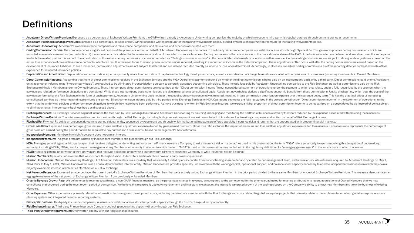 35 Definitions • Accelerant Direct Written Premium: Expressed as a percentage of Exchange Written Premium, the GWP written directly by Accelerant Underwriting companies, the majority of which we cede to third-party risk capital partners through our reinsurance arrangements. • Accelerant-Retained Exchange Premium: Expressed as a percentage, as Accelerant GWP net of ceded written premium for the trailing twelve month period, divided by total Exchange Written Premium for the trailing twelve month period. • Accelerant Underwriting: Accelerant’s owned insurance companies and reinsurance companies, and all revenue and expenses associated with them. • Ceding Commission Income: The company cedes a significant portion of the premiums written on behalf of Accelerant Underwriting companies to third-party reinsurance companies or institutional investors through Flywheel Re. This generates positive ceding commissions which are recorded as a reimbursement for (and reduction of) the acquisition costs related to the reinsurance portion of the ceded insurance business. Ceding commissions that are in excess of the proportionate share of the DAC of the business ceded are deferred and amortized over the same period in which the related premium is earned. The amortization of this excess ceding commission income is recorded as “Ceding commission income” in the consolidated statements of operations within revenue. Certain ceding commissions are subject to sliding scale adjustments based on the actual loss experience of covered insurance contracts, which can result in the need for us to refund previous commissions received, resulting in a reduction of income in the determined period. These adjustments often occur well after the ceding commissions are earned based on the development of insurance liabilities. In such instances, commission adjustments are not subject to deferral and are instead recorded directly as income or loss when determined. Accordingly, in all cases, we adjust ceding commissions as of the reporting date for our best estimate of loss experience for reinsured insurance policies. • Depreciation and Amortization: Depreciation and amortization expenses primarily relate to amortization of capitalized technology development costs, as well as amortization of intangible assets associated with acquisitions of businesses (including investments in Owned Members). • Direct Commission Income: Accounting treatment of direct commissions received in the Exchange Services and the MGA Operations segments depend on whether the direct commission is being paid on an intercompany basis or by a third party. Direct commissions paid by one Accelerant entity to another (referred to as “intercompany basis”) are required to be eliminated in consolidation pursuant to generally accepted accounting principles. These include fees paid by Accelerant Underwriting companies to the Risk Exchange, as well as commissions paid by the Risk Exchange to Mission Members and/or to Owned Members. These intercompany direct commissions are recognized under “Direct commission income” in our consolidated statement of operations under the segment to which they relate, and are fully recognized by the segment when the services and related performance obligations are completed. While these intercompany basis commissions are all eliminated on a consolidated basis, Accelerant nevertheless derives a significant economic benefit from these commissions. Unlike third parties, which bear the costs of the services performed by the Risk Exchange in the form of cash payments, Accelerant Underwriting does not bear the cost of such services once fully eliminated, resulting in less commission amortization expense over the insurance policy term. This has the practical effect of increasing consolidated earnings as the corresponding premiums are earned. Direct commission income paid by third parties in the Exchange Services or MGA Operations segments are fully recognized in the current period under “Direct commission income” in the statement of operations, to the extent that the underlying services and performance obligations to which they relate have been performed. As more business is written by Risk Exchange Insurers, we expect a higher proportion of direct commission income to be recognized on a consolidated basis (instead of being subject to elimination on an intercompany business basis as discussed above). • Exchange Services: Our Exchange Services segment includes the fees paid by Risk Exchange Insurers and Accelerant Underwriting for sourcing, managing and monitoring the portfolio of business written by Members reduced by the expenses associated with providing these services. • Exchange Written Premium: The total gross written premium written through the Risk Exchange, including both gross written premiums written on behalf of Accelerant Underwriting companies and written on behalf of Risk Exchange Insurers. • Flywheel Re: Flywheel Re Ltd. is an unconsolidated reinsurance sidecar entity, sponsored by Accelerant and through which institutional investors are offered specialty insurance risk and returns that are uncorrelated with broader financial markets. • Gross Loss Ratio: Expressed as a percentage, gross incurred losses and loss adjustment expense divided by gross earned premium. Gross loss ratio excludes the impact of premium and loss and loss adjustment expense ceded to reinsurers. Gross loss ratio represents the percentage of gross premium earned during the period that will be required to pay current and future claims, based on management’s best estimates. • Independent Members: Members in which Accelerant does not own an interest. • Independent Premium: The gross premium written by Independent Members and placed through our Risk Exchange. • MGA: Managing general agent; a third-party agent that receives delegated underwriting authority from a Primary Insurance Company to write insurance risk on its beha