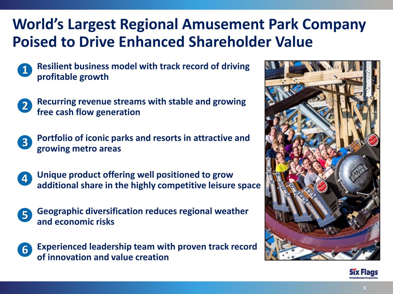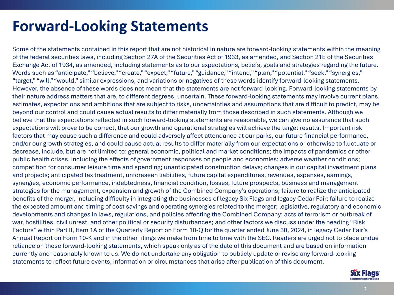 Forward-Looking Statements Some of the statements contained in this report that are not historical in nature are forward-looking statements within the meaning of the federal securities laws, including Section 27A of the Securities Act of 1933, as amended, and Section 21E of the Securities Exchange Act of 1934, as amended, including statements as to our expectations, beliefs, goals and strategies regarding the future. Words such as “anticipate,” “believe,” “create,” “expect,” “future,” “guidance,” “intend,” “plan,” “potential,” “seek,” “synergies,” “target,” “will,” “would,” similar expressions, and variations or negatives of these words identify forward-looking statements. However, the absence of these words does not mean that the statements are not forward-looking. Forward-looking statements by their nature address matters that are, to different degrees, uncertain. These forward-looking statements may involve current plans, estimates, expectations and ambitions that are subject to risks, uncertainties and assumptions that are difficult to predict, may be beyond our control and could cause actual results to differ materially from those described in such statements. Although we believe that the expectations reflected in such forward-looking statements are reasonable, we can give no assurance that such expectations will prove to be correct, that our growth and operational strategies will achieve the target results. Important risk factors that may cause such a difference and could adversely affect attendance at our parks, our future financial performance, and/or our growth strategies, and could cause actual results to differ materially from our expectations or otherwise to fluctuate or decrease, include, but are not limited to: general economic, political and market conditions; the impacts of pandemics or other public health crises, including the effects of government responses on people and economies; adverse weather conditions; competition for consumer leisure time and spending; unanticipated construction delays; changes in our capital investment plans and projects; anticipated tax treatment, unforeseen liabilities, future capital expenditures, revenues, expenses, earnings, synergies, economic performance, indebtedness, financial condition, losses, future prospects, business and management strategies for the management, expansion and growth of the Combined Company’s operations; failure to realize the anticipated benefits of the merger, including difficulty in integrating the businesses of legacy Six Flags and legacy Cedar Fair; failure to realize the expected amount and timing of cost savings and operating synergies related to the merger; legislative, regulatory and economic developments and changes in laws, regulations, and policies affecting the Combined Company; acts of terrorism or outbreak of war, hostilities, civil unrest, and other political or security disturbances; and other factors we discuss under the heading “Risk Factors” within Part II, Item 1A of the Quarterly Report on Form 10-Q for the quarter ended June 30, 2024, in legacy Cedar Fair’s Annual Report on Form 10-K and in the other filings we make from time to time with the SEC. Readers are urged not to place undue reliance on these forward-looking statements, which speak only as of the date of this document and are based on information currently and reasonably known to us. We do not undertake any obligation to publicly update or revise any forward-looking statements to reflect future events, information or circumstances that arise after publication of this document. 2