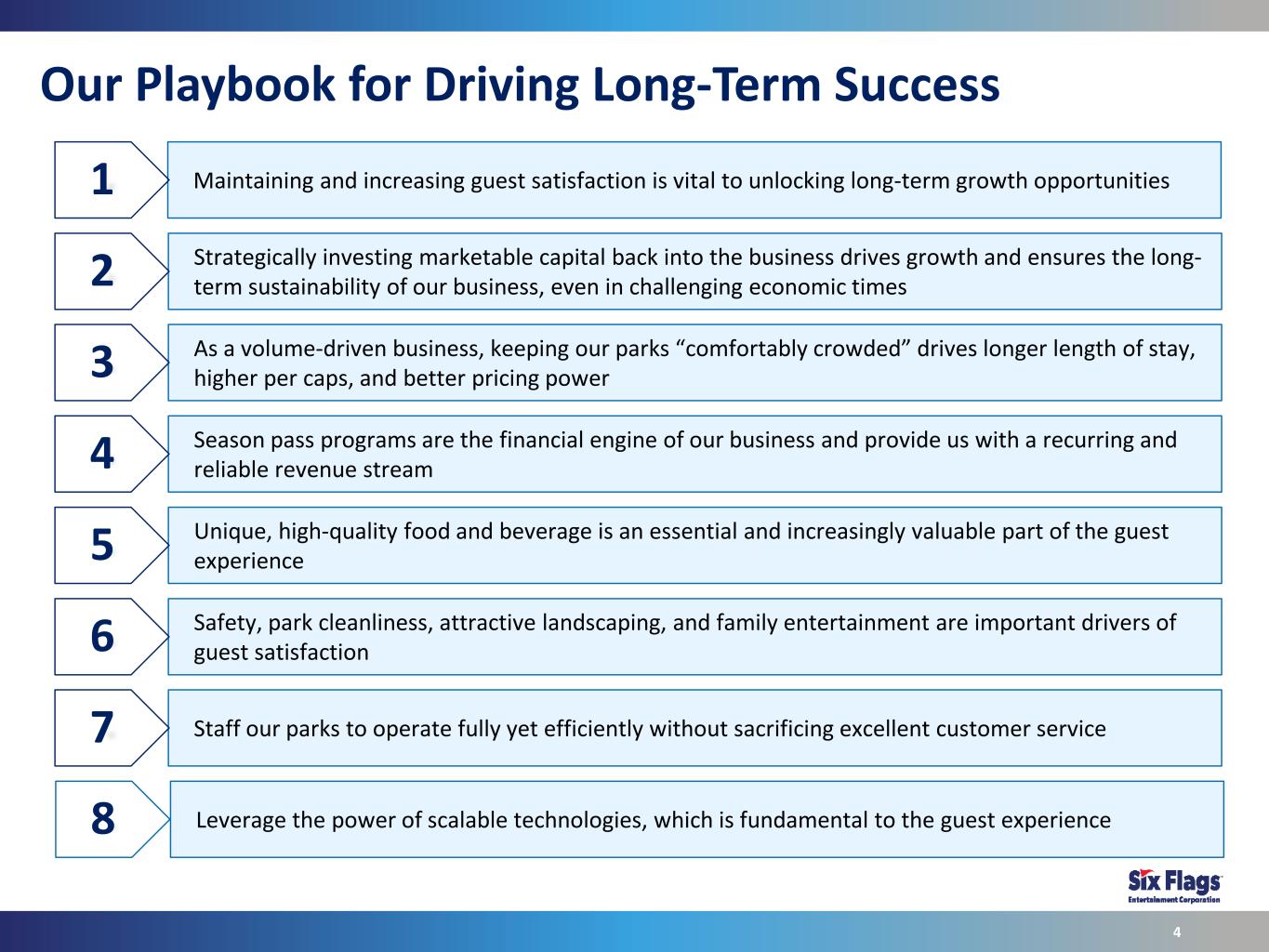 World’s Largest Regional Amusement Park Company Poised to Drive Enhanced Shareholder Value 3 Portfolio of iconic parks and resorts in attractive and growing metro areas Unique product offering well positioned to grow additional share in the highly competitive leisure space Geographic diversification reduces regional weather and economic risks Recurring revenue streams with stable and growing free cash flow generation Resilient business model with track record of driving profitable growth Experienced leadership team with proven track record of innovation and value creation 1 2 5 4 3 6