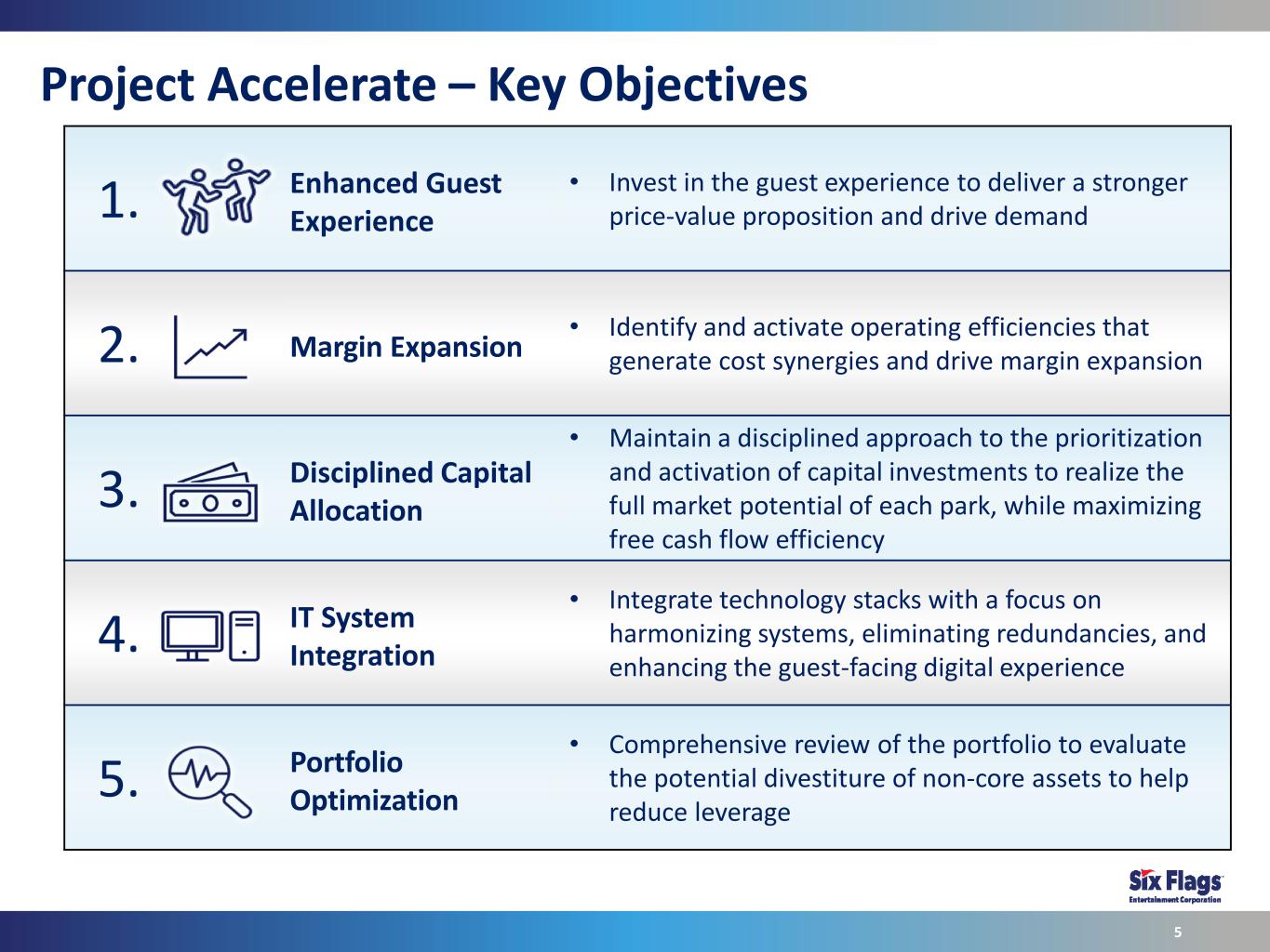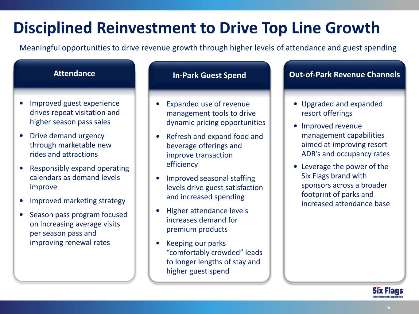 1. Enhanced Guest Experience • Invest in the guest experience to deliver a stronger price-value proposition and drive demand 2. Margin Expansion • Identify and activate operating efficiencies that generate cost synergies and drive margin expansion 3. Disciplined Capital Allocation • Maintain a disciplined approach to the prioritization and activation of capital investments to realize the full market potential of each park, while maximizing free cash flow efficiency 4. IT System Integration • Integrate technology stacks with a focus on harmonizing systems, eliminating redundancies, and enhancing the guest-facing digital experience 5. Portfolio Optimization • Comprehensive review of the portfolio to evaluate the potential divestiture of non-core assets to help reduce leverage Project Accelerate – Key Objectives 5
