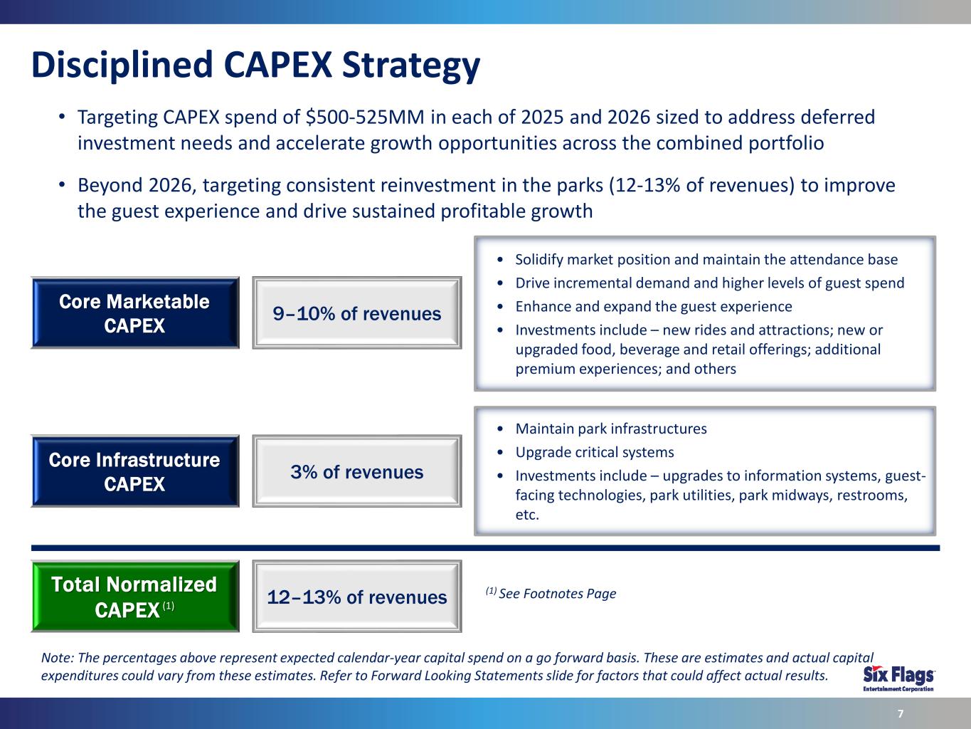 Disciplined Reinvestment to Drive Top Line Growth 6 Meaningful opportunities to drive revenue growth through higher levels of attendance and guest spending Out-of-Park Revenue Channels • Upgraded and expanded resort offerings • Improved revenue management capabilities aimed at improving resort ADR’s and occupancy rates • Leverage the power of the Six Flags brand with sponsors across a broader footprint of parks and increased attendance base In-Park Guest Spend • Expanded use of revenue management tools to drive dynamic pricing opportunities • Refresh and expand food and beverage offerings and improve transaction efficiency • Improved seasonal staffing levels drive guest satisfaction and increased spending • Higher attendance levels increases demand for premium products • Keeping our parks “comfortably crowded” leads to longer lengths of stay and higher guest spend Attendance • Improved guest experience drives repeat visitation and higher season pass sales • Drive demand urgency through marketable new rides and attractions • Responsibly expand operating calendars as demand levels improve • Improved marketing strategy • Season pass program focused on increasing average visits per season pass and improving renewal rates