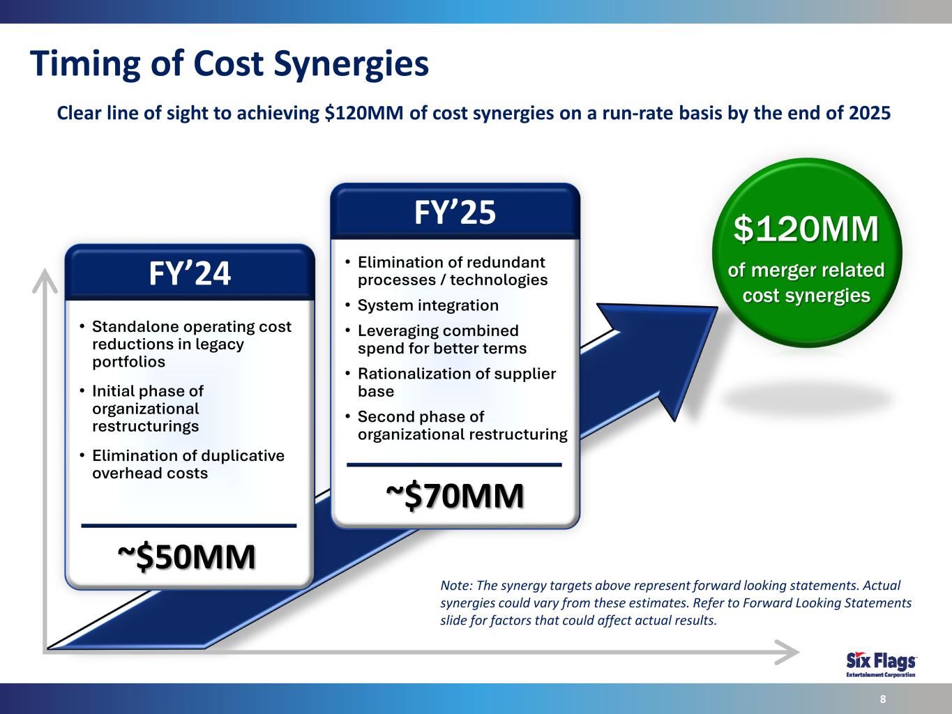 Disciplined CAPEX Strategy 7 Core Marketable CAPEX • Maintain park infrastructures • Upgrade critical systems • Investments include – upgrades to information systems, guest- facing technologies, park utilities, park midways, restrooms, etc. 9–10% of revenues Core Infrastructure CAPEX Total Normalized CAPEX (1) 3% of revenues 12–13% of revenues • Targeting CAPEX spend of $500-525MM in each of 2025 and 2026 sized to address deferred investment needs and accelerate growth opportunities across the combined portfolio • Beyond 2026, targeting consistent reinvestment in the parks (12-13% of revenues) to improve the guest experience and drive sustained profitable growth • Solidify market position and maintain the attendance base • Drive incremental demand and higher levels of guest spend • Enhance and expand the guest experience • Investments include – new rides and attractions; new or upgraded food, beverage and retail offerings; additional premium experiences; and others (1) See Footnotes Page Note: The percentages above represent expected calendar-year capital spend on a go forward basis. These are estimates and actual capital expenditures could vary from these estimates. Refer to Forward Looking Statements slide for factors that could affect actual results.
