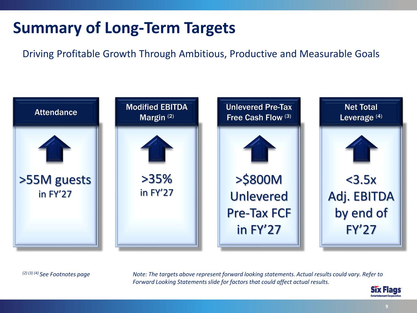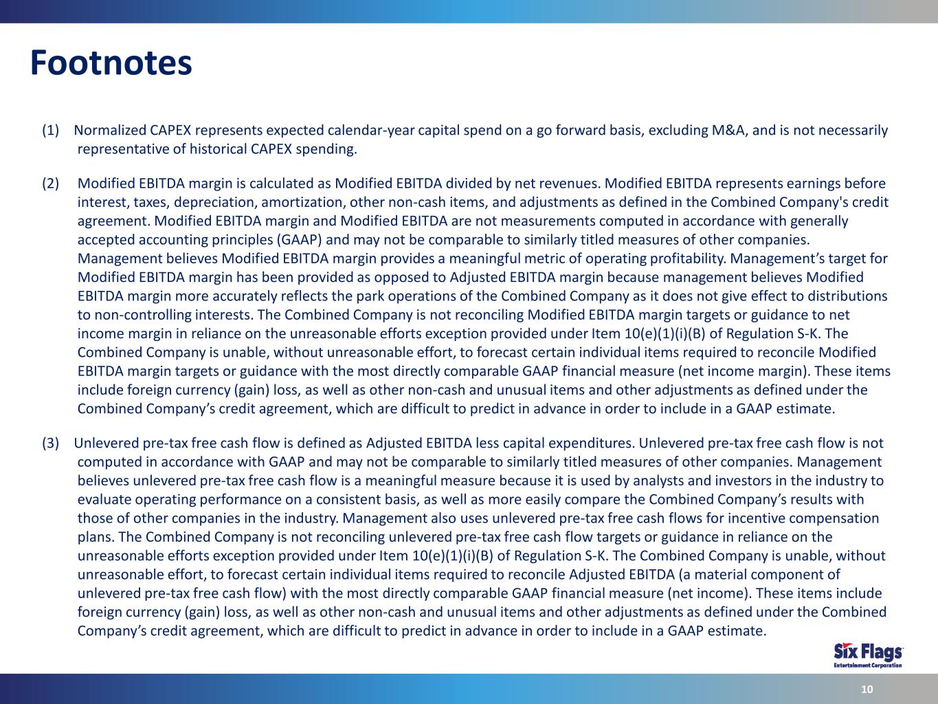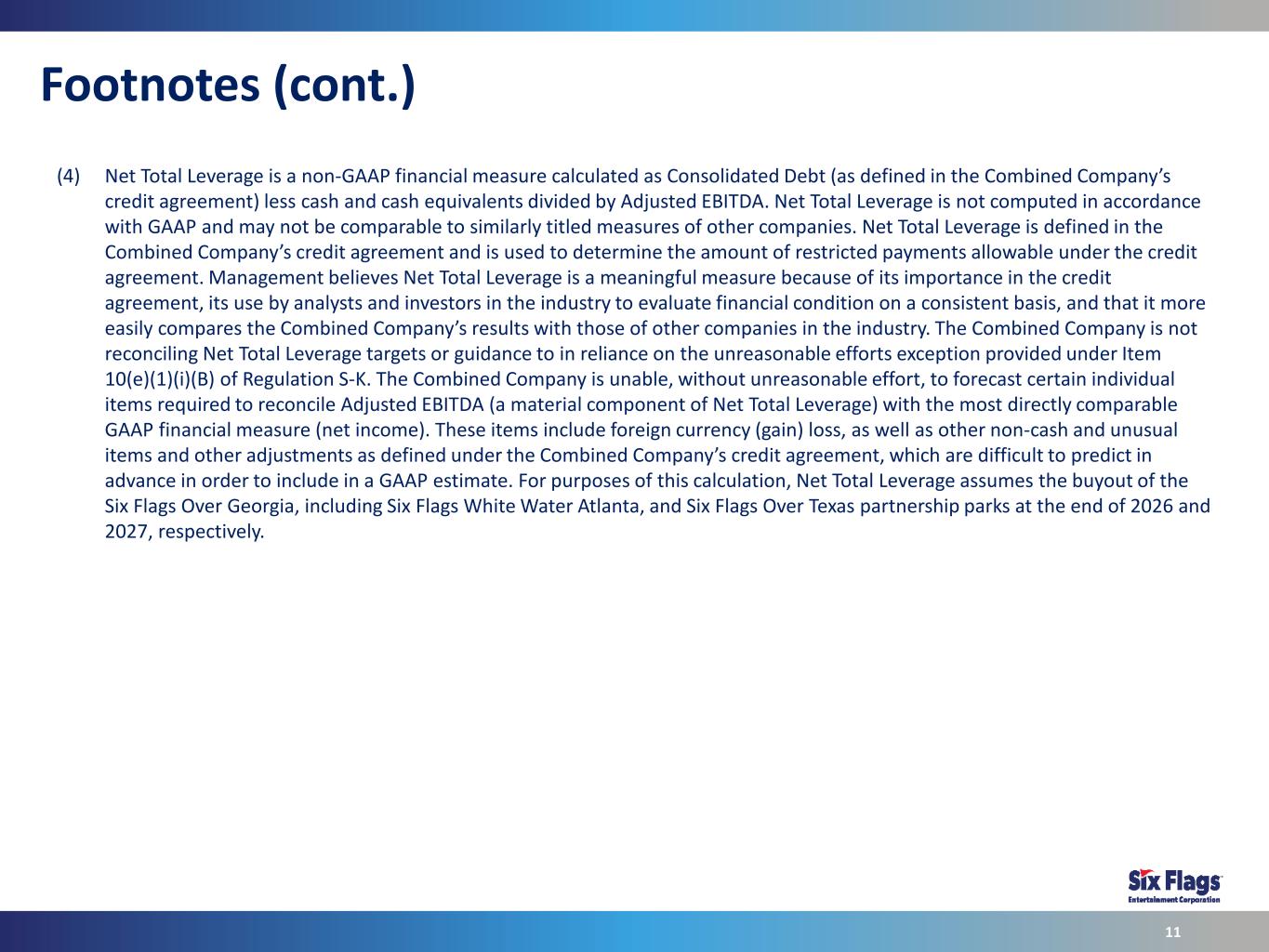Footnotes (1) Normalized CAPEX represents expected calendar-year capital spend on a go forward basis, excluding M&A, and is not necessarily representative of historical CAPEX spending. (2) Modified EBITDA margin is calculated as Modified EBITDA divided by net revenues. Modified EBITDA represents earnings before interest, taxes, depreciation, amortization, other non-cash items, and adjustments as defined in the Combined Company's credit agreement. Modified EBITDA margin and Modified EBITDA are not measurements computed in accordance with generally accepted accounting principles (GAAP) and may not be comparable to similarly titled measures of other companies. Management believes Modified EBITDA margin provides a meaningful metric of operating profitability. Management’s target for Modified EBITDA margin has been provided as opposed to Adjusted EBITDA margin because management believes Modified EBITDA margin more accurately reflects the park operations of the Combined Company as it does not give effect to distributions to non-controlling interests. The Combined Company is not reconciling Modified EBITDA margin targets or guidance to net income margin in reliance on the unreasonable efforts exception provided under Item 10(e)(1)(i)(B) of Regulation S-K. The Combined Company is unable, without unreasonable effort, to forecast certain individual items required to reconcile Modified EBITDA margin targets or guidance with the most directly comparable GAAP financial measure (net income margin). These items include foreign currency (gain) loss, as well as other non-cash and unusual items and other adjustments as defined under the Combined Company’s credit agreement, which are difficult to predict in advance in order to include in a GAAP estimate. (3) Unlevered pre-tax free cash flow is defined as Adjusted EBITDA less capital expenditures. Unlevered pre-tax free cash flow is not computed in accordance with GAAP and may not be comparable to similarly titled measures of other companies. Management believes unlevered pre-tax free cash flow is a meaningful measure because it is used by analysts and investors in the industry to evaluate operating performance on a consistent basis, as well as more easily compare the Combined Company’s results with those of other companies in the industry. Management also uses unlevered pre-tax free cash flows for incentive compensation plans. The Combined Company is not reconciling unlevered pre-tax free cash flow targets or guidance in reliance on the unreasonable efforts exception provided under Item 10(e)(1)(i)(B) of Regulation S-K. The Combined Company is unable, without unreasonable effort, to forecast certain individual items required to reconcile Adjusted EBITDA (a material component of unlevered pre-tax free cash flow) with the most directly comparable GAAP financial measure (net income). These items include foreign currency (gain) loss, as well as other non-cash and unusual items and other adjustments as defined under the Combined Company’s credit agreement, which are difficult to predict in advance in order to include in a GAAP estimate. 10