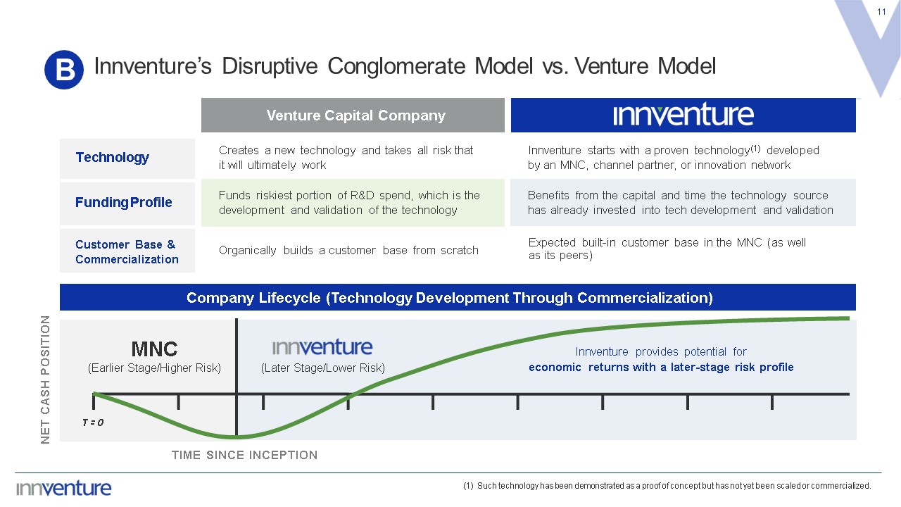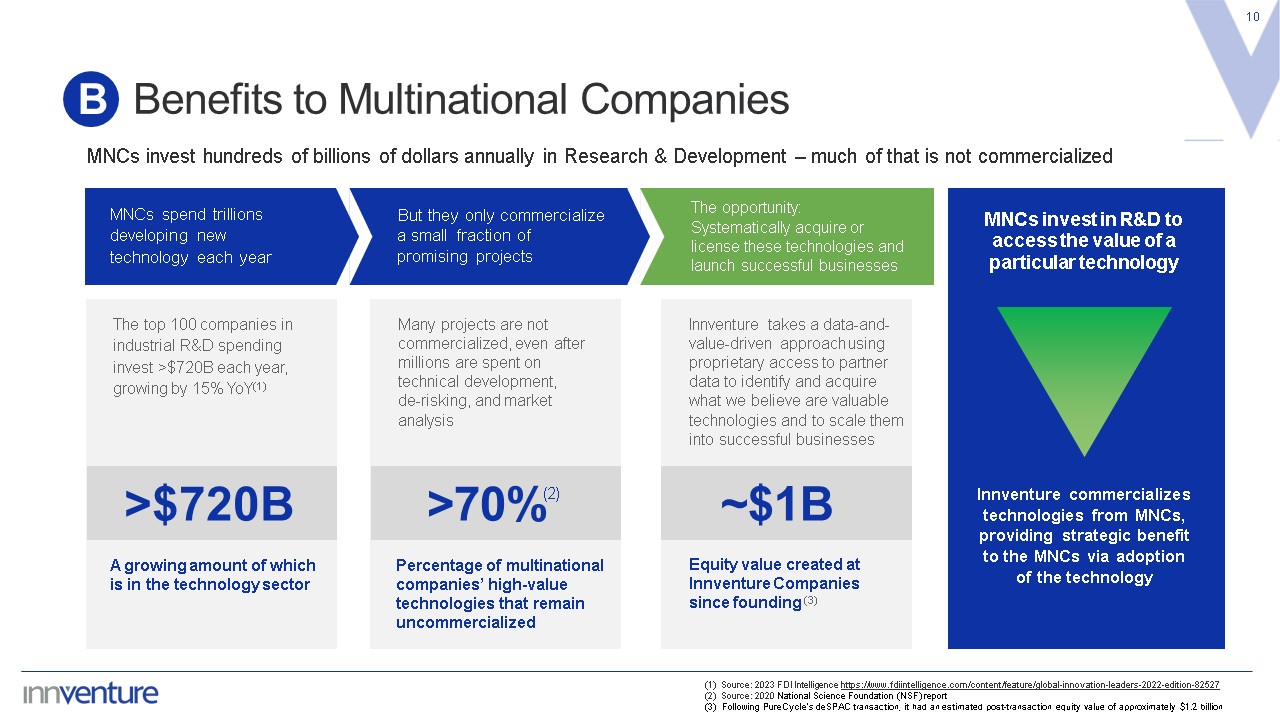 Benefits to Multinational Companies  10  B  MNCs invest hundreds of billions of dollars annually in Research & Development – much of that is not commercialized  (1) Source: 2023 FDI Intelligence https://www.fdiintelligence.com/content/feature/global-innovation-leaders-2022-edition-82527  (2) Source: 2020 National Science Foundation (NSF) report  (3) Following PureCycle’s deSPAC transaction, it had an estimated post-transaction equity value of approximately $1.2 billion  MNCs invest in R&D to access the value of a particular technology  Innventure commercializes technologies from MNCs, providing strategic benefit to the MNCs via adoption of the technology  ~$1B  MNCs spend trillions developing new technology each year  But they only commercialize a small fraction of promising projects  The opportunity:   Systematically acquire or license these technologies and launch successful businesses  Many projects are not commercialized, even after millions are spent on technical development, de-risking, and market analysis  Innventure takes a data-and- value-driven approach using proprietary access to partner data to identify and acquire what we believe are valuable technologies and to scale them into successful businesses  Equity value created at Innventure Companies since founding (3)  >70%  (2)  Percentage of multinational companies’ high-value technologies that remain uncommercialized  The top 100 companies in industrial R&D spending invest >$720B each year, growing by 15% YoY(1)  >$720B  A growing amount of which is in the technology sector