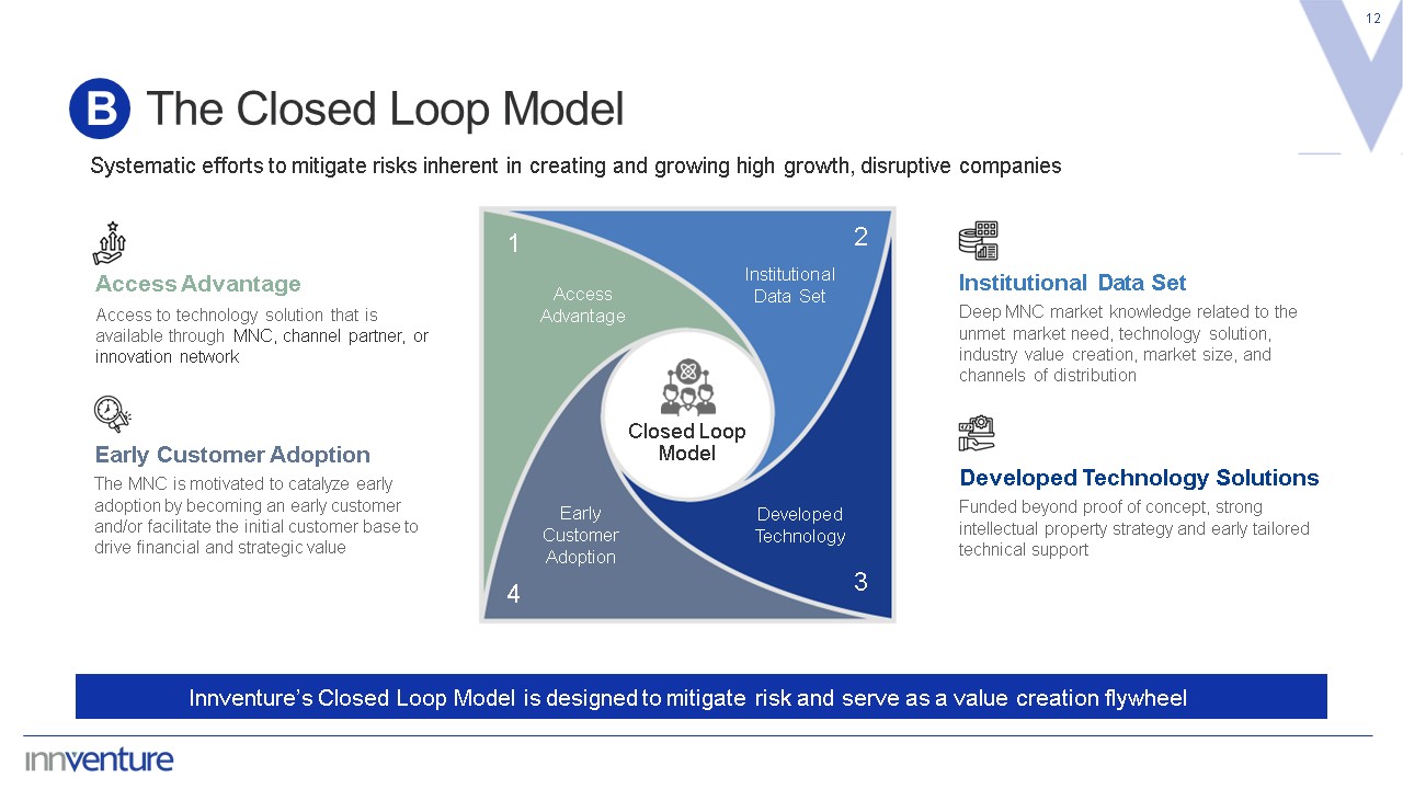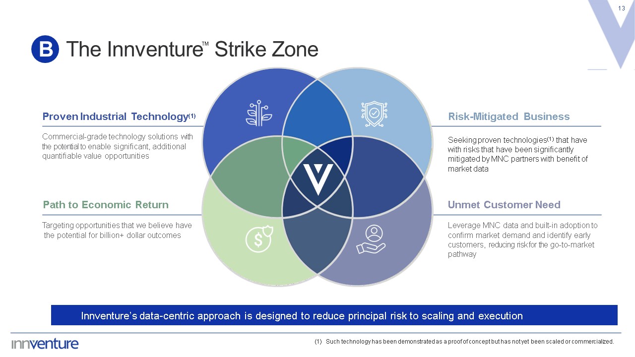 The Closed Loop Model  12  B  Systematic efforts to mitigate risks inherent in creating and growing high growth, disruptive companies  Innventure’s Closed Loop Model is designed to mitigate risk and serve as a value creation flywheel  Access Advantage  Access to technology solution that is available through MNC, channel partner, or innovation network  Early Customer Adoption  The MNC is motivated to catalyze early adoption by becoming an early customer and/or facilitate the initial customer base to drive financial and strategic value  Institutional Data Set  Deep MNC market knowledge related to the unmet market need, technology solution, industry value creation, market size, and channels of distribution  Developed Technology Solutions  Funded beyond proof of concept, strong intellectual property strategy and early tailored technical support  Early  Customer Adoption  Access  Advantage  Institutional  Data Set  Developed  Technology  Closed Loop  Model  1  2  3  4