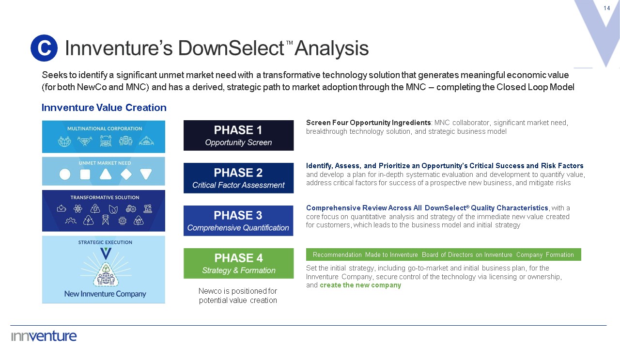 Proven Industrial Technology(1)  Commercial-grade technology solutions with the potential to enable significant, additional quantifiable value opportunities  Path to Economic Return  Targeting opportunities that we believe have   the potential for billion+ dollar outcomes  The Innventure Strike Zone  13  B  Innventure’s data-centric approach is designed to reduce principal risk to scaling and execution  Risk-Mitigated Business  Seeking proven technologies(1) that have with risks that have been significantly mitigated by MNC partners with benefit of market data  Unmet Customer Need  Leverage MNC data and built-in adoption to confirm market demand and identify early customers, reducing risk for the go-to-market pathway  (1) Such technology has been demonstrated as a proof of concept but has not yet been scaled or commercialized.  ™