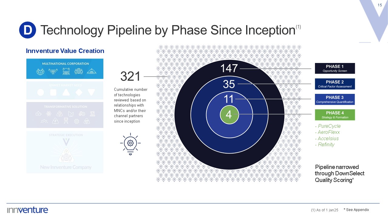Cumulative number of technologies reviewed based on relationships with MNCs and/or their channel partners since inception  Technology Pipeline by Phase Since Inception  15  D  Innventure Value Creation  * See Appendix  (1)  321  147  35  11  4  - PureCycle  - AeroFlexx  - Accelsius  - Refinity  Pipeline narrowed through DownSelect Quality Scoring*  (1) As of 1 jan25