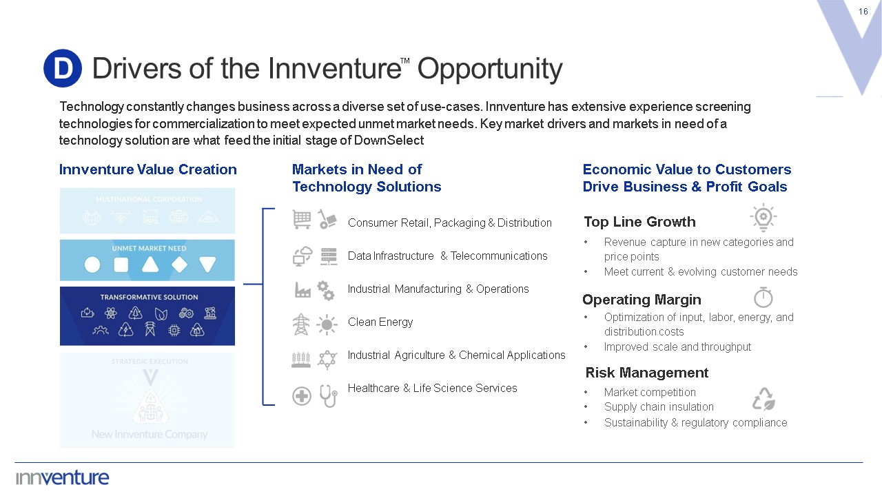 Drivers of the Innventure Opportunity  16  D  Technology constantly changes business across a diverse set of use-cases. Innventure has extensive experience screening technologies for commercialization to meet expected unmet market needs. Key market drivers and markets in need of a technology solution are what feed the initial stage of DownSelect  Innventure Value Creation  Markets in Need of Technology Solutions  Consumer Retail, Packaging & Distribution  Data Infrastructure & Telecommunications  Industrial Manufacturing & Operations  Clean Energy  Industrial Agriculture & Chemical Applications  Healthcare & Life Science Services  Economic Value to Customers Drive Business & Profit Goals  Revenue capture in new categories and price points  Meet current & evolving customer needs  Operating Margin  Optimization of input, labor, energy, and distribution costs  Improved scale and throughput  Market competition  Supply chain insulation  Sustainability & regulatory compliance  Top Line Growth  Risk Management  ™