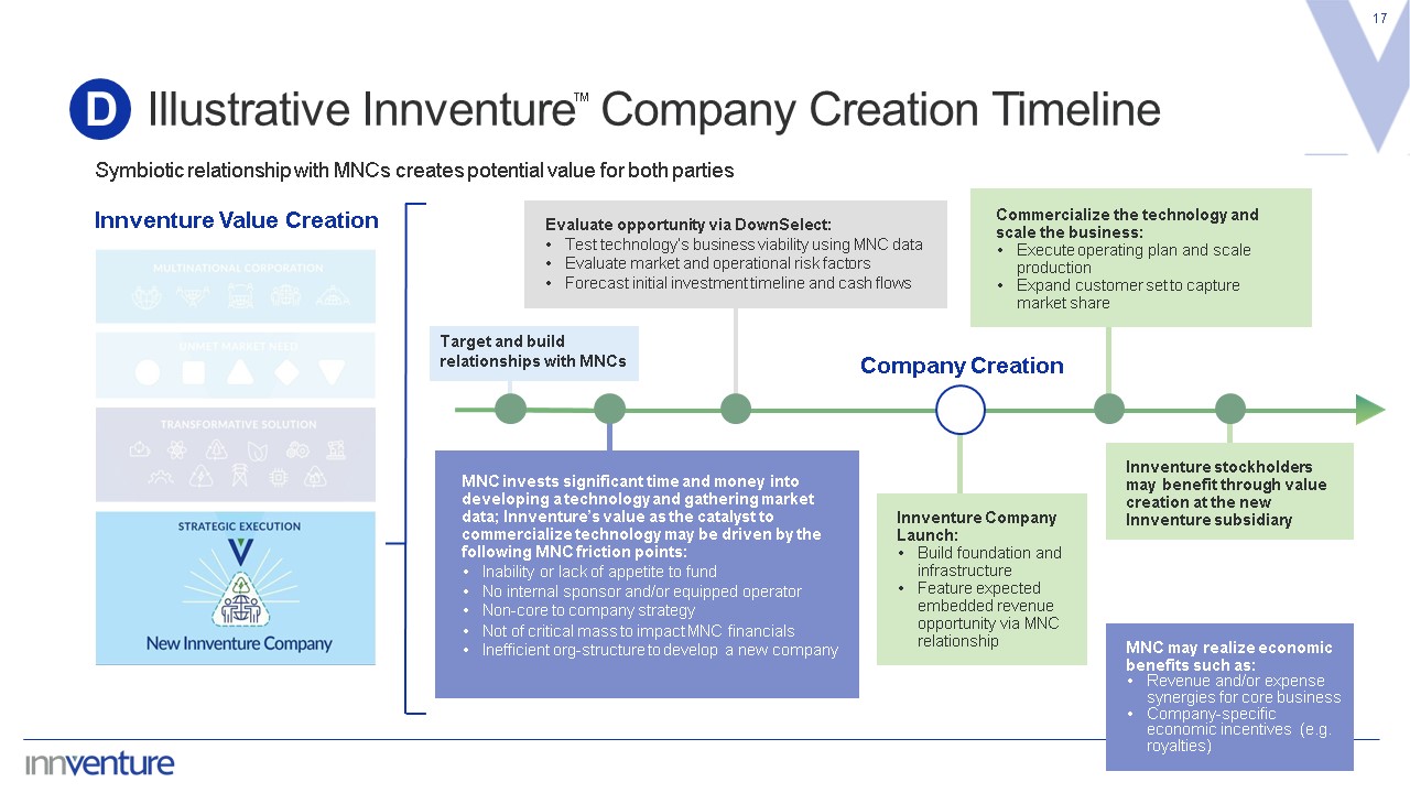 Illustrative Innventure Company Creation Timeline  17  D  Symbiotic relationship with MNCs creates potential value for both parties  Innventure Value Creation  Company Creation  Target and build relationships with MNCs  Evaluate opportunity via DownSelect:  Test technology’s business viability using MNC data  Evaluate market and operational risk factors  Forecast initial investment timeline and cash flows  Commercialize the technology and scale the business:  Execute operating plan and scale production  Expand customer set to capture market share  MNC invests significant time and money into developing a technology and gathering market data; Innventure’s value as the catalyst to commercialize technology may be driven by the following MNC friction points:  Inability or lack of appetite to fund  No internal sponsor and/or equipped operator  Non-core to company strategy  Not of critical mass to impact MNC financials  Inefficient org-structure to develop a new company  Innventure Company Launch:  Build foundation and infrastructure  Feature expected embedded revenue opportunity via MNC relationship  Innventure stockholders may benefit through value creation at the new Innventure subsidiary  MNC may realize economic benefits such as:  Revenue and/or expense synergies for core business  Company-specific economic incentives (e.g. royalties)  ™