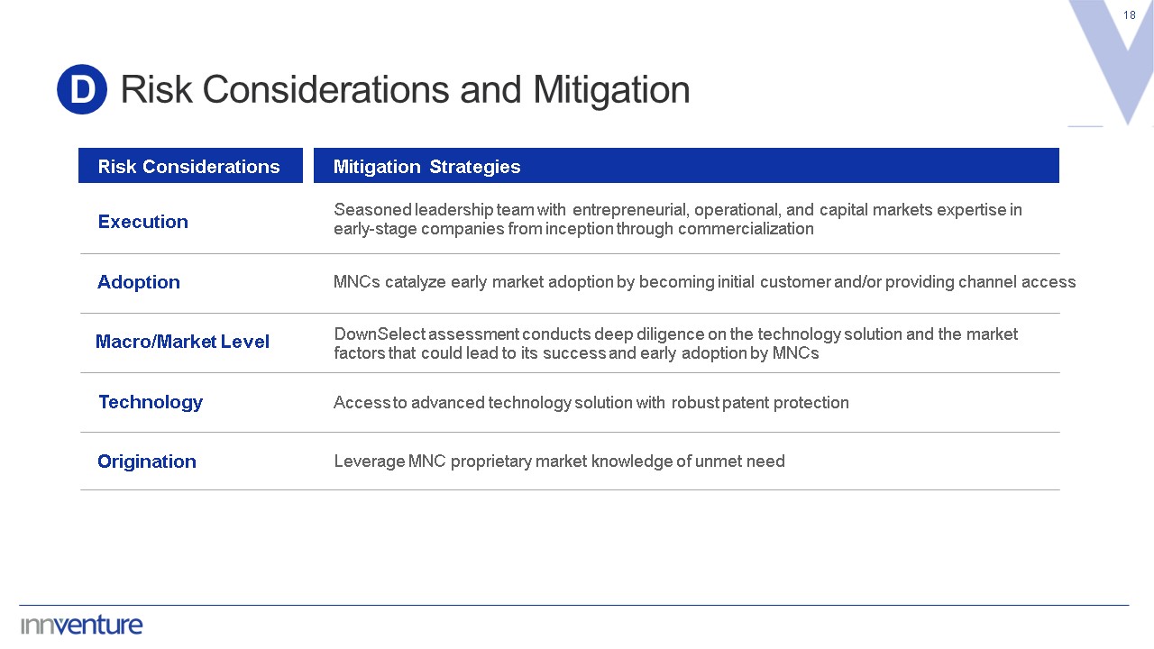 Execution  Seasoned leadership team with entrepreneurial, operational, and capital markets expertise in early-stage companies from inception through commercialization  Adoption  MNCs catalyze early market adoption by becoming initial customer and/or providing channel access  Macro/Market Level  DownSelect assessment conducts deep diligence on the technology solution and the market factors that could lead to its success and early adoption by MNCs  Technology  Access to advanced technology solution with robust patent protection  Origination  Leverage MNC proprietary market knowledge of unmet need  Risk Considerations and Mitigation  18  D  Risk Considerations  Mitigation Strategies