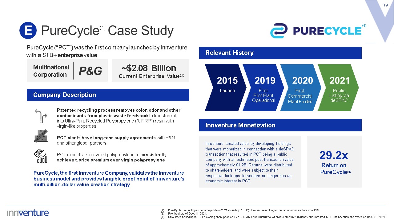 PureCycle Technologies became public in 2021 (Nasdaq: “PCT”) Innventure no longer has an economic interest in PCT.  Pitchbook as of Dec. 31, 2024.   Calculated based upon PCT's closing share price on Dec. 31, 2024 and illustrative of an investor's return if they had invested in PCT at inception and exited on Dec. 31, 2024.  PureCycle Case Study  19  E  PureCycle (“PCT”) was the first company launched by Innventure with a $1B+ enterprise value  Company Description  Relevant History  Innventure Monetization  First  Pilot Plant Operational  First Commercial Plant Funded  (1)  Launch  Public  Listing via deSPAC  Multinational  Corporation  P&G  Current Enterprise Value(2)  ~$2.08 Billion  Patented recycling process removes color, odor and other contaminants from plastic waste feedstock to transform it into Ultra-Pure Recycled Polypropylene (“UPRP”) resin with virgin-like properties  PCT plants have long-term supply agreements with P&G and other global partners  PCT expects its recycled polypropylene to consistently achieve a price premium over virgin polypropylene  PureCycle, the first Innventure Company, validates the Innventure business model and provides tangible proof point of Innventure’s multi-billion-dollar value creation strategy.  2019  2020  2015  2021  Innventure created value by developing holdings that were monetized in connection with a deSPAC transaction that resulted in PCT being a public company with an estimated post-transaction value of approximately $1.2B. Returns were distributed to shareholders and were subject to their respective lock-ups. Innventure no longer has an economic interest in PCT.  29.2x  Return on   PureCycle(3)  (1)
