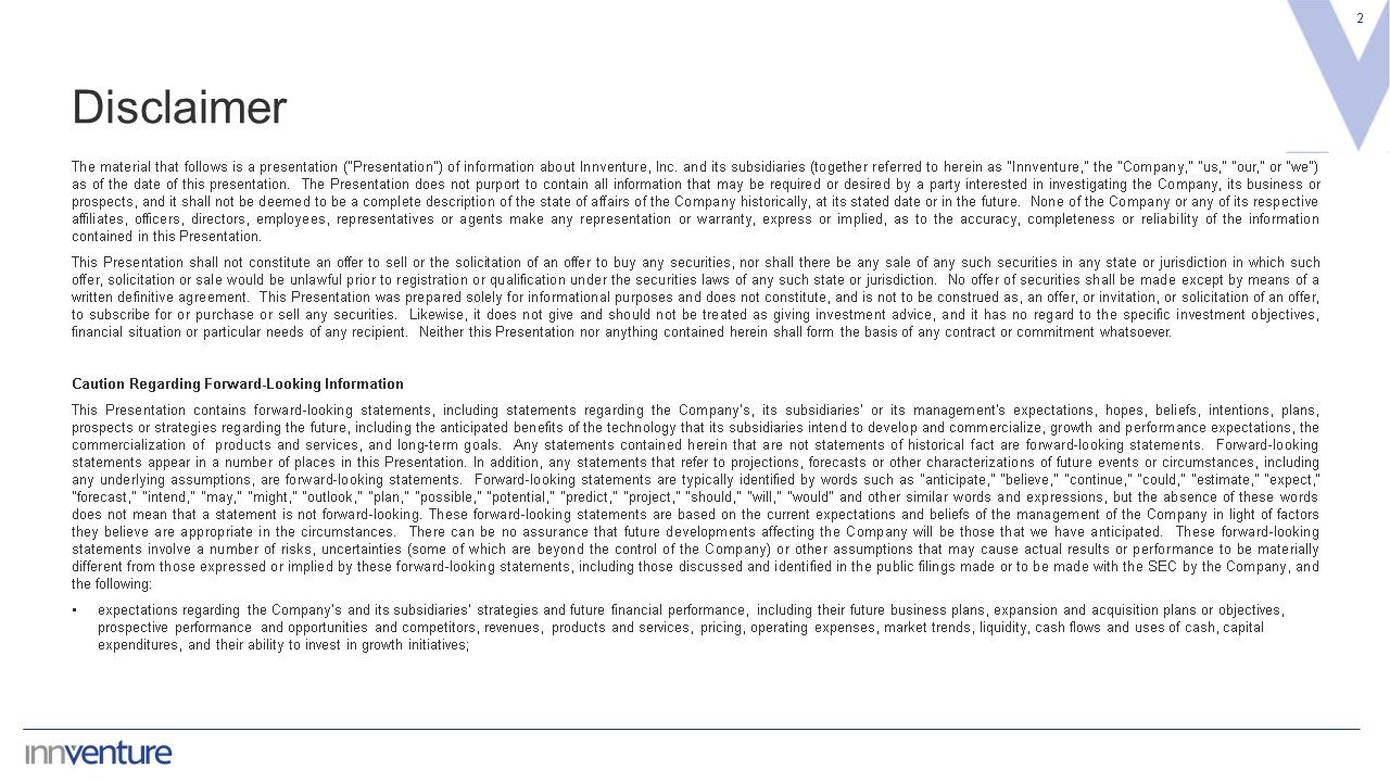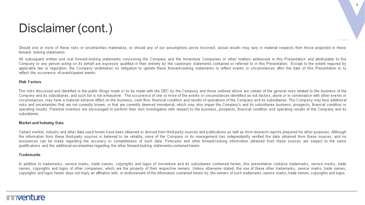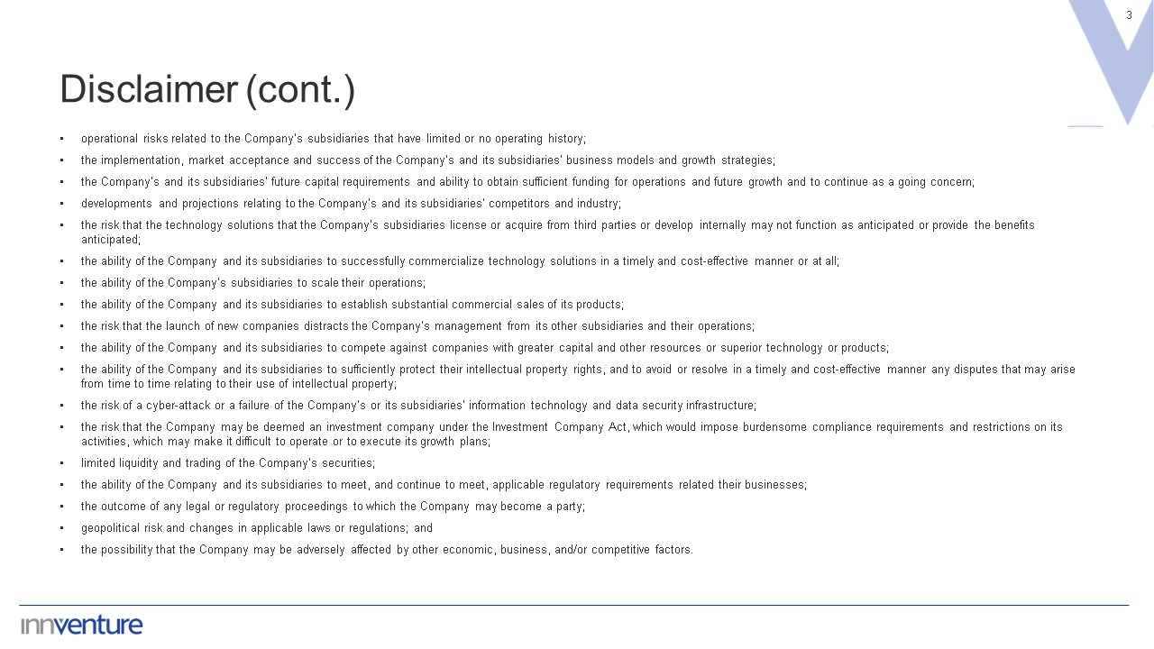 Disclaimer  2  The material that follows is a presentation ("Presentation") of information about Innventure, Inc. and its subsidiaries (together referred to herein as "Innventure," the "Company," "us," "our," or "we") as of the date of this presentation. The Presentation does not purport to contain all information that may be required or desired by a party interested in investigating the Company, its business or prospects, and it shall not be deemed to be a complete description of the state of affairs of the Company historically, at its stated date or in the future. None of the Company or any of its respective affiliates, officers, directors, employees, representatives or agents make any representation or warranty, express or implied, as to the accuracy, completeness or reliability of the information contained in this Presentation.   This Presentation shall not constitute an offer to sell or the solicitation of an offer to buy any securities, nor shall there be any sale of any such securities in any state or jurisdiction in which such offer, solicitation or sale would be unlawful prior to registration or qualification under the securities laws of any such state or jurisdiction. No offer of securities shall be made except by means of a written definitive agreement. This Presentation was prepared solely for informational purposes and does not constitute, and is not to be construed as, an offer, or invitation, or solicitation of an offer, to subscribe for or purchase or sell any securities. Likewise, it does not give and should not be treated as giving investment advice, and it has no regard to the specific investment objectives, financial situation or particular needs of any recipient. Neither this Presentation nor anything contained herein shall form the basis of any contract or commitment whatsoever.  Caution Regarding Forward-Looking Information  This Presentation contains forward-looking statements, including statements regarding the Company’s, its subsidiaries’ or its management's expectations, hopes, beliefs, intentions, plans, prospects or strategies regarding the future, including the anticipated benefits of the technology that its subsidiaries intend to develop and commercialize, growth and performance expectations, the commercialization of products and services, and long-term goals. Any statements contained herein that are not statements of historical fact are forward-looking statements. Forward-looking statements appear in a number of places in this Presentation. In addition, any statements that refer to projections, forecasts or other characterizations of future events or circumstances, including any underlying assumptions, are forward-looking statements. Forward-looking statements are typically identified by words such as "anticipate," "believe," "continue," "could," "estimate," "expect," "forecast," "intend," "may," "might," "outlook," "plan," "possible," "potential," "predict," "project," "should," "will," "would" and other similar words and expressions, but the absence of these words does not mean that a statement is not forward-looking. These forward-looking statements are based on the current expectations and beliefs of the management of the Company in light of factors they believe are appropriate in the circumstances. There can be no assurance that future developments affecting the Company will be those that we have anticipated. These forward-looking statements involve a number of risks, uncertainties (some of which are beyond the control of the Company) or other assumptions that may cause actual results or performance to be materially different from those expressed or implied by these forward-looking statements, including those discussed and identified in the public filings made or to be made with the SEC by the Company, and the following:  expectations regarding the Company’s and its subsidiaries’ strategies and future financial performance, including their future business plans, expansion and acquisition plans or objectives, prospective performance and opportunities and competitors, revenues, products and services, pricing, operating expenses, market trends, liquidity, cash flows and uses of cash, capital expenditures, and their ability to invest in growth initiatives;