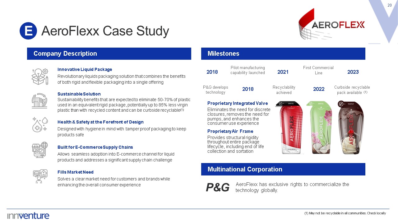 AeroFlexx Case Study  20  E  Company Description  Milestones  Multinational Corporation  (1) May not be recyclable in all communities. Check locally  P&G  AeroFlexx has exclusive rights to commercialize the technology globally.  Innovative Liquid Package  Revolutionary liquids packaging solution that combines the benefits  of both rigid and flexible packaging into a single offering  Sustainable Solution  Sustainability benefits that are expected to eliminate 50-70% of plastic used in an equivalent rigid package, potentially up to 85% less virgin plastic than with recycled content and can be curbside recyclable(1)  Health & Safety at the Forefront of Design  Designed with hygiene in mind with tamper proof packaging to keep  products safe  Built for E-Commerce Supply Chains  Allows seamless adoption into E-commerce channel for liquid products and addresses a significant supply chain challenge  Fills Market Need  Solves a clear market need for customers and brands while enhancing the overall consumer experience  Proprietary Integrated Valve  Eliminates the need for discrete closures, removes the need for pumps, and enhances the consumer use experience  Proprietary Air Frame  Provides structural rigidity throughout entire package lifecycle, including end of life collection and sortation  P&G develops technology  Recyclability achieved  First Commercial  Line  Curbside recyclable pack available (1)  Pilot manufacturing capability launched  2018  2018  2022  2021  2023
