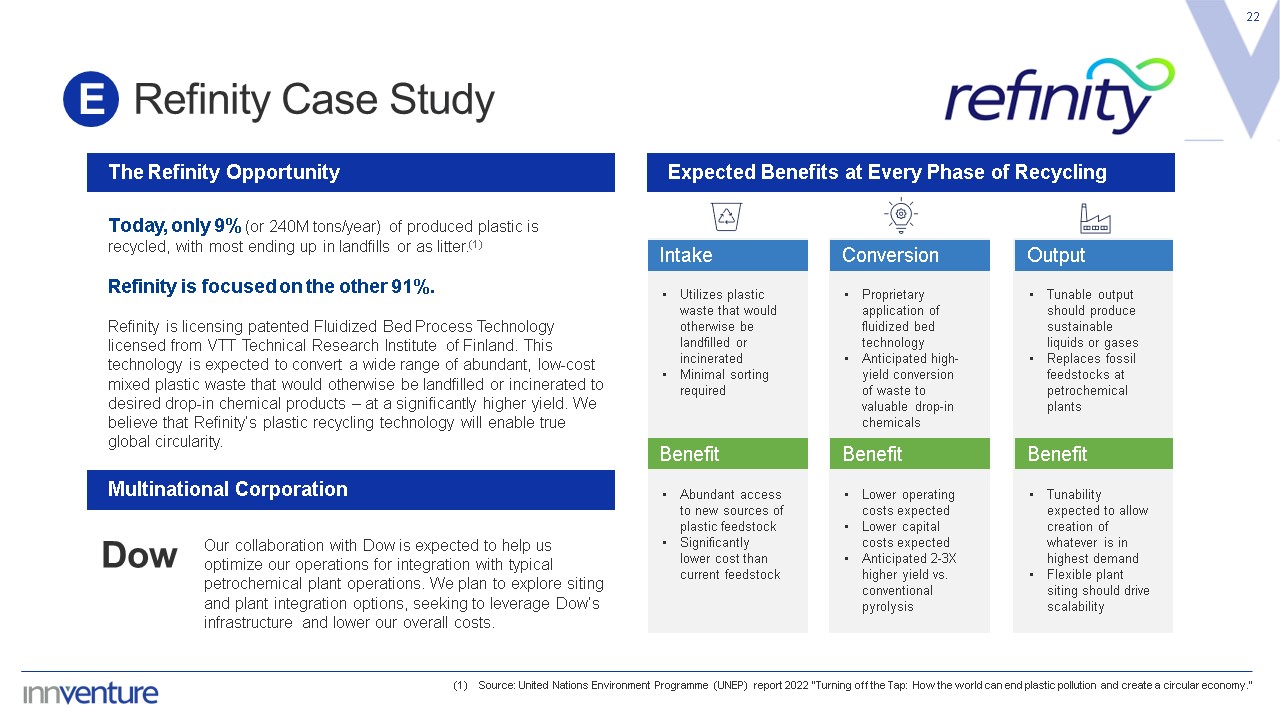 Today, only 9% (or 240M tons/year) of produced plastic is recycled, with most ending up in landfills or as litter.(1)   Refinity is focused on the other 91%.   Refinity is licensing patented Fluidized Bed Process Technology licensed from VTT Technical Research Institute of Finland. This technology is expected to convert a wide range of abundant, low-cost mixed plastic waste that would otherwise be landfilled or incinerated to desired drop-in chemical products – at a significantly higher yield. We believe that Refinity’s plastic recycling technology will enable true global circularity.  22  The Refinity Opportunity  Expected Benefits at Every Phase of Recycling  Dow  Our collaboration with Dow is expected to help us optimize our operations for integration with typical petrochemical plant operations. We plan to explore siting and plant integration options, seeking to leverage Dow’s infrastructure and lower our overall costs.   Multinational Corporation  Utilizes plastic waste that would otherwise be landfilled or incinerated  Minimal sorting required  Intake  Proprietary application of fluidized bed technology  Anticipated high-yield conversion of waste to valuable drop-in chemicals  Conversion  Tunable output should produce sustainable liquids or gases  Replaces fossil feedstocks at petrochemical plants  Output  Benefit  Benefit  Benefit  Abundant access to new sources of plastic feedstock  Significantly lower cost than current feedstock  Lower operating costs expected  Lower capital costs expected  Anticipated 2-3X higher yield vs. conventional pyrolysis  Tunability expected to allow creation of whatever is in highest demand  Flexible plant siting should drive scalability  Refinity Case Study  E  (1) Source: United Nations Environment Programme (UNEP) report 2022 "Turning off the Tap: How the world can end plastic pollution and create a circular economy."