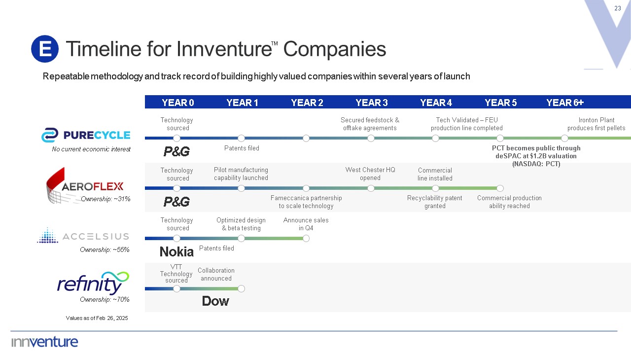 Timeline for Innventure Companies  23  E  Repeatable methodology and track record of building highly valued companies within several years of launch  YEAR 0  YEAR 1  YEAR 2  YEAR 3  YEAR 4  YEAR 5  YEAR 6+  No current economic interest  Technology sourced  P&G  Patents filed  Secured feedstock & offtake agreements  Tech Validated – FEU production line completed  Ironton Plant produces first pellets  Ownership: ~31%  Technology sourced  P&G  Pilot manufacturing capability launched  Ownership: ~55%  Technology sourced  Nokia  Patents filed  Ownership: ~70%  Collaboration announced  Dow  VTT  Technology  sourced  Fameccanica partnership  to scale technology  West Chester HQ opened  Commercial   line installed  Recyclability patent granted  Commercial production ability reached  Optimized design  & beta testing  Announce sales  in Q4  PCT becomes public through deSPAC at $1.2B valuation (NASDAQ: PCT)  ™  Values as of Feb 26, 2025