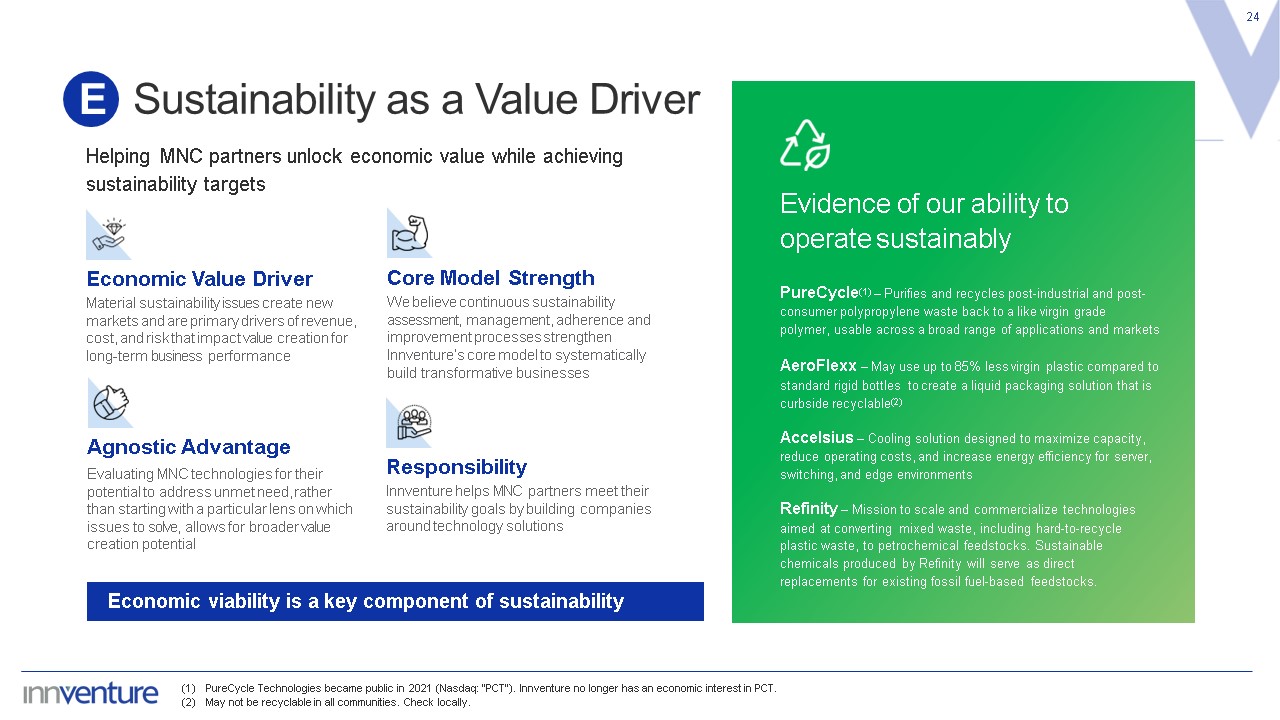 Sustainability as a Value Driver  24  E  Helping MNC partners unlock economic value while achieving   sustainability targets  Evidence of our ability to  operate sustainably  PureCycle(1) – Purifies and recycles post-industrial and post-consumer polypropylene waste back to a like virgin grade polymer, usable across a broad range of applications and markets  AeroFlexx – May use up to 85% less virgin plastic compared to standard rigid bottles to create a liquid packaging solution that is curbside recyclable(2)  Accelsius – Cooling solution designed to maximize capacity, reduce operating costs, and increase energy efficiency for server, switching, and edge environments  Refinity – Mission to scale and commercialize technologies aimed at converting mixed waste, including hard-to-recycle plastic waste, to petrochemical feedstocks. Sustainable chemicals produced by Refinity will serve as direct replacements for existing fossil fuel-based feedstocks.  Responsibility  Innventure helps MNC partners meet their sustainability goals by building companies around technology solutions  Economic Value Driver  Material sustainability issues create new markets and are primary drivers of revenue, cost, and risk that impact value creation for long-term business performance  Core Model Strength  We believe continuous sustainability assessment, management, adherence and improvement processes strengthen Innventure’s core model to systematically build transformative businesses  Agnostic Advantage  Evaluating MNC technologies for their potential to address unmet need, rather than starting with a particular lens on which issues to solve, allows for broader value creation potential  Economic viability is a key component of sustainability  PureCycle Technologies became public in 2021 (Nasdaq: “PCT”). Innventure no longer has an economic interest in PCT.  May not be recyclable in all communities. Check locally.