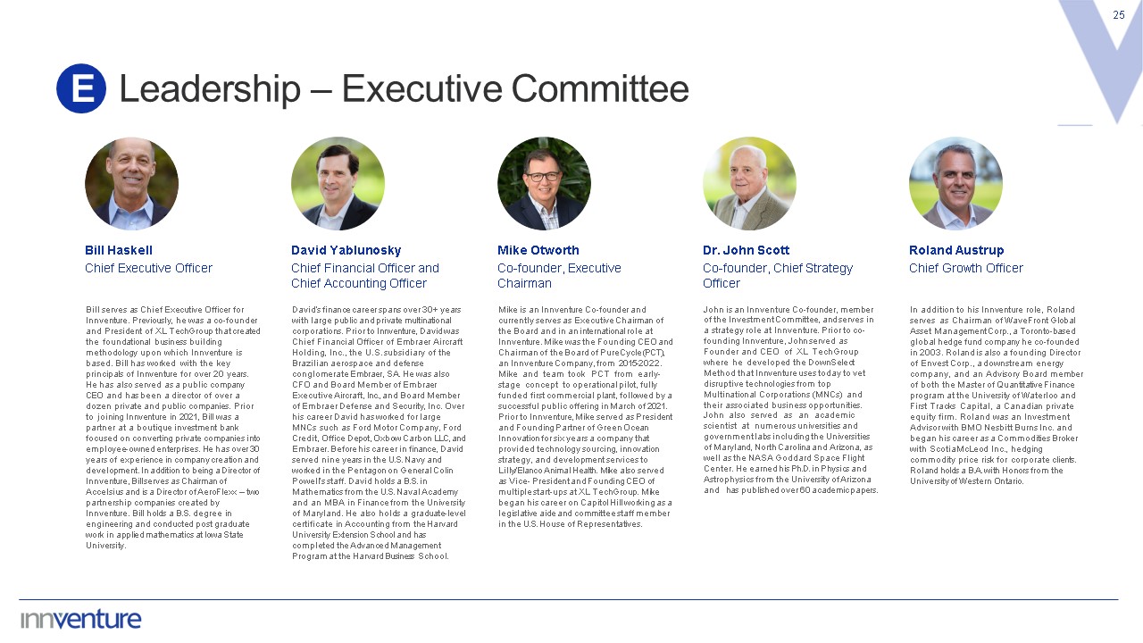 Leadership – Executive Committee  25  E  David Yablunosky   Chief Financial Officer and Chief Accounting Officer  David’s finance career spans over 30+ years with large public and private multinational corporations. Prior to Innventure, David was Chief Financial Officer of Embraer Aircraft Holding, Inc., the U.S. subsidiary of the Brazilian aerospace and defense conglomerate Embraer, SA. He was also CFO and Board Member of Embraer Executive Aircraft, Inc., and Board Member of Embraer Defense and Security, Inc. Over his career David has worked for large MNCs such as Ford Motor Company, Ford Credit, Office Depot, Oxbow Carbon LLC, and Embraer. Before his career in finance, David served nine years in the U.S. Navy and worked in the Pentagon on General Colin Powell’s staff. David holds a B.S. in Mathematics from the U.S. Naval Academy and an MBA in Finance from the University of Maryland. He also holds a graduate-level certificate in Accounting from the Harvard University Extension School and has completed the Advanced Management Program at the Harvard Business School.  Bill Haskell  Chief Executive Officer  Bill serves as Chief Executive Officer for Innventure. Previously, he was a co-founder and President of XL TechGroup that created the foundational business building methodology upon which Innventure is based. Bill has worked with the key principals of Innventure for over 20 years. He has also served as a public company CEO and has been a director of over a dozen private and public companies. Prior to joining Innventure in 2021, Bill was a partner at a boutique investment bank focused on converting private companies into employee-owned enterprises. He has over 30 years of experience in company creation and development. In addition to being a Director of Innventure, Bill serves as Chairman of Accelsius and is a Director of AeroFlexx – two partnership companies created by Innventure. Bill holds a B.S. degree in engineering and conducted post graduate work in applied mathematics at Iowa State University.  Dr. John Scott   Co-founder, Chief Strategy Officer  John is an Innventure Co-founder, member of the Investment Committee, and serves in a strategy role at Innventure. Prior to co-founding Innventure, John served as Founder and CEO of XL TechGroup where he developed the DownSelect Method that Innventure uses today to vet disruptive technologies from top Multinational Corporations (MNCs) and their associated business opportunities. John also served as an academic scientist at numerous universities and government labs including the Universities of Maryland, North Carolina and Arizona, as well as the NASA Goddard Space Flight Center. He earned his Ph.D. in Physics and Astrophysics from the University of Arizona and has published over 60 academic papers.  Mike Otworth   Co-founder, Executive Chairman  Mike is an Innventure Co-founder and currently serves as Executive Chairman of the Board and in an international role at Innventure. Mike was the Founding CEO and Chairman of the Board of PureCycle (PCT), an Innventure Company, from 2015-2022. Mike and team took PCT from early-stage concept to operational pilot, fully funded first commercial plant, followed by a successful public offering in March of 2021. Prior to Innventure, Mike served as President and Founding Partner of Green Ocean Innovation for six years a company that provided technology sourcing, innovation strategy, and development services to Lilly/Elanco Animal Health. Mike also served as Vice- President and Founding CEO of multiple start-ups at XL TechGroup. Mike began his career on Capitol Hill working as a legislative aide and committee staff member in the U.S. House of Representatives.  Roland Austrup   Chief Growth Officer  In addition to his Innventure role, Roland serves as Chairman of WaveFront Global Asset Management Corp., a Toronto-based global hedge fund company he co-founded in 2003. Roland is also a founding Director of Envest Corp., a downstream energy company, and an Advisory Board member of both the Master of Quantitative Finance program at the University of Waterloo and First Tracks Capital, a Canadian private equity firm. Roland was an Investment Advisor with BMO Nesbitt Burns Inc. and began his career as a Commodities Broker with ScotiaMcLeod Inc., hedging commodity price risk for corporate clients. Roland holds a B.A. with Honors from the University of Western Ontario.