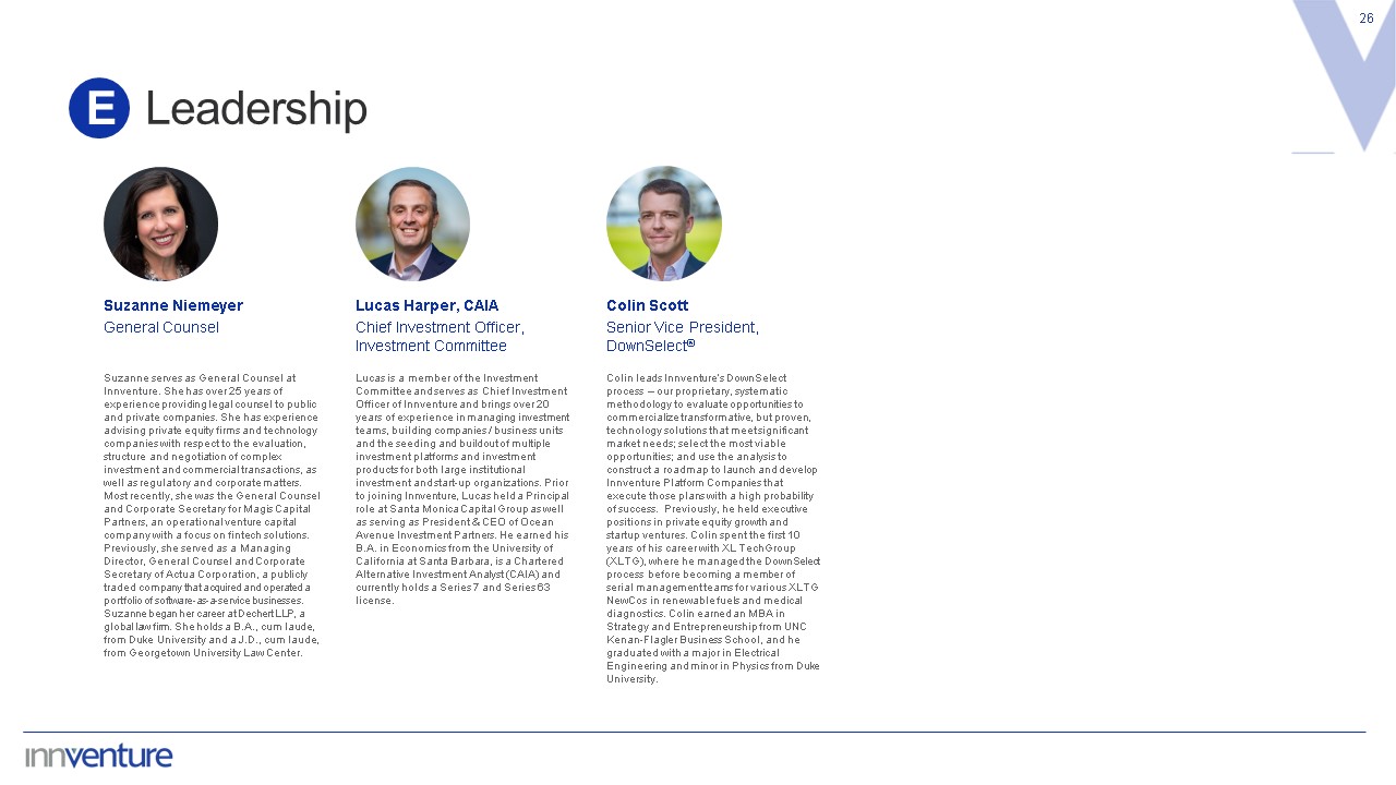 Colin Scott   Senior Vice President, DownSelect®  Colin leads Innventure’s DownSelect process – our proprietary, systematic methodology to evaluate opportunities to commercialize transformative, but proven, technology solutions that meet significant market needs; select the most viable opportunities; and use the analysis to construct a roadmap to launch and develop Innventure Platform Companies that execute those plans with a high probability of success. Previously, he held executive positions in private equity growth and startup ventures. Colin spent the first 10 years of his career with XL TechGroup (XLTG), where he managed the DownSelect process before becoming a member of serial management teams for various XLTG NewCos in renewable fuels and medical diagnostics. Colin earned an MBA in Strategy and Entrepreneurship from UNC Kenan-Flagler Business School, and he graduated with a major in Electrical Engineering and minor in Physics from Duke University.  Lucas Harper, CAIA   Chief Investment Officer, Investment Committee  Lucas is a member of the Investment Committee and serves as Chief Investment Officer of Innventure and brings over 20 years of experience in managing investment teams, building companies / business units and the seeding and buildout of multiple investment platforms and investment products for both large institutional investment and start-up organizations. Prior to joining Innventure, Lucas held a Principal role at Santa Monica Capital Group as well as serving as President & CEO of Ocean Avenue Investment Partners. He earned his B.A. in Economics from the University of California at Santa Barbara, is a Chartered Alternative Investment Analyst (CAIA) and currently holds a Series 7 and Series 63 license.  Suzanne Niemeyer   General Counsel  Suzanne serves as General Counsel at Innventure. She has over 25 years of experience providing legal counsel to public and private companies. She has experience advising private equity firms and technology companies with respect to the evaluation, structure and negotiation of complex investment and commercial transactions, as well as regulatory and corporate matters. Most recently, she was the General Counsel and Corporate Secretary for Magis Capital Partners, an operational venture capital company with a focus on fintech solutions. Previously, she served as a Managing Director, General Counsel and Corporate Secretary of Actua Corporation, a publicly traded company that acquired and operated a portfolio of software-as-a-service businesses. Suzanne began her career at Dechert LLP, a global law firm. She holds a B.A., cum laude, from Duke University and a J.D., cum laude, from Georgetown University Law Center.  Leadership  26  E
