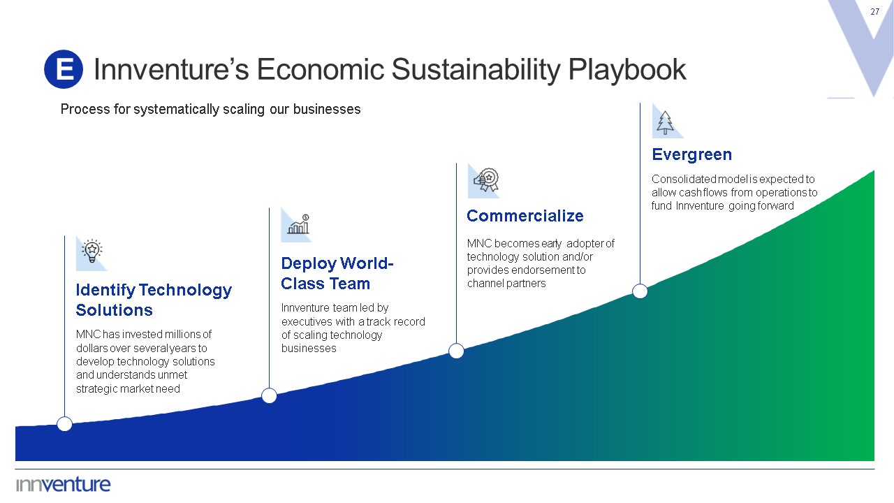 Innventure’s Economic Sustainability Playbook  27  E  Process for systematically scaling our businesses  Identify Technology  Solutions  MNC has invested millions of dollars over several years to develop technology solutions and understands unmet strategic market need  Deploy World- Class Team  Innventure team led by executives with a track record of scaling technology businesses  Commercialize  MNC becomes early adopter of technology solution and/or provides endorsement to channel partners  Evergreen  Consolidated model is expected to allow cash flows from operations to fund Innventure going forward