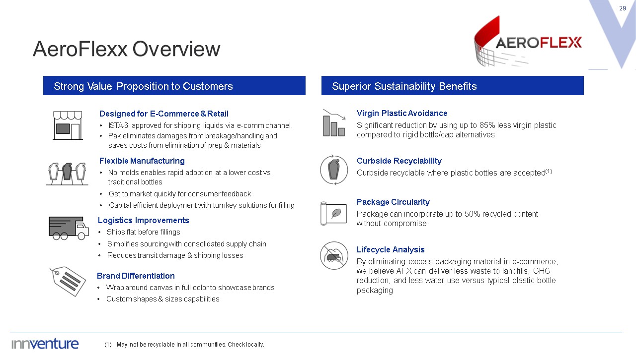 Package Circularity  Package can incorporate up to 50% recycled content without compromise  AeroFlexx Overview  29  Virgin Plastic Avoidance  Significant reduction by using up to 85% less virgin plastic compared to rigid bottle/cap alternatives  Designed for E-Commerce & Retail  ISTA-6 approved for shipping liquids via e-comm channel.  Pak eliminates damages from breakage/handling and saves costs from elimination of prep & materials  Flexible Manufacturing  No molds enables rapid adoption at a lower cost vs.  traditional bottles  Get to market quickly for consumer feedback  Capital efficient deployment with turnkey solutions for filling  Logistics Improvements  Ships flat before fillings  Simplifies sourcing with consolidated supply chain  Reduces transit damage & shipping losses  Brand Differentiation  Wrap around canvas in full color to showcase brands  Custom shapes & sizes capabilities  Strong Value Proposition to Customers  Superior Sustainability Benefits  Curbside Recyclability  Curbside recyclable where plastic bottles are accepted(1)  Lifecycle Analysis  By eliminating excess packaging material in e-commerce, we believe AFX can deliver less waste to landfills, GHG reduction, and less water use versus typical plastic bottle packaging  (1) May not be recyclable in all communities. Check locally.