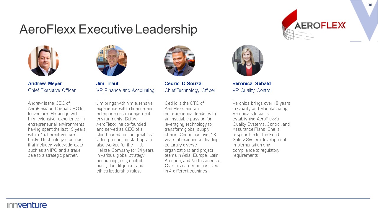 30  Jim Traut  VP, Finance and Accounting  Jim brings with him extensive experience within finance and enterprise risk management environments. Before AeroFlexx, he co-founded and served as CEO of a cloud-based motion graphics video production start-up. Jim also worked for the H. J. Heinze Company for 24 years in various global strategy, accounting, risk, control, audit, due diligence, and ethics leadership roles.  Andrew Meyer  Chief Executive Officer  Andrew is the CEO of AeroFlexx and Serial CEO for Innventure. He brings with him extensive experience in entrepreneurial environments having spent the last 15 years within 4 different venture-backed technology start-ups that included value-add exits such as an IPO and a trade sale to a strategic partner.  Veronica Sebald  VP, Quality Control  Veronica brings over 18 years in Quality and Manufacturing. Veronica's focus is establishing AeroFlexx’s Quality Systems, Control, and Assurance Plans. She is responsible for the Food Safety System development, implementation and compliance to regulatory requirements.  Cedric D’Souza  Chief Technology Officer  Cedric is the CTO of AeroFlexx and an entrepreneurial leader with an insatiable passion for leveraging technology to transform global supply chains. Cedric has over 28 years of experience, leading culturally diverse organizations and project teams in Asia, Europe, Latin America, and North America. Over his career he has lived in 4 different countries.  AeroFlexx Executive Leadership
