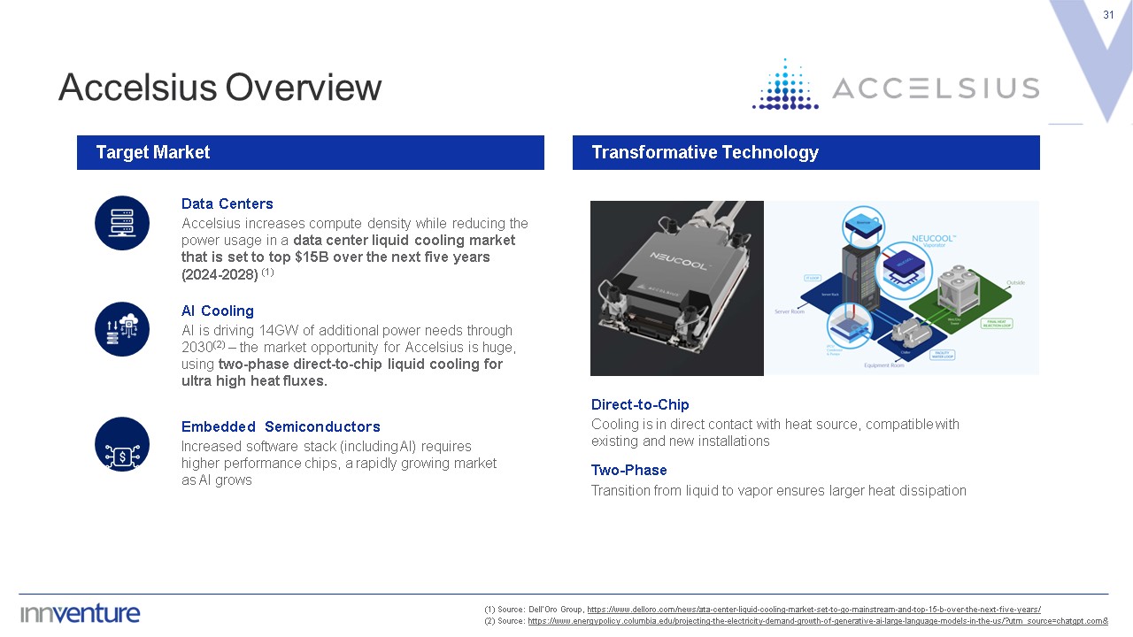 Accelsius Overview  31  Direct-to-Chip  Cooling is in direct contact with heat source, compatible with existing and new installations  AI Cooling  AI is driving 14GW of additional power needs through 2030(2) – the market opportunity for Accelsius is huge, using two-phase direct-to-chip liquid cooling for ultra high heat fluxes.  Embedded Semiconductors  Increased software stack (including AI) requires higher performance chips, a rapidly growing market as AI grows  Target Market  Transformative Technology  Two-Phase  Transition from liquid to vapor ensures larger heat dissipation  (1) Source: Dell’Oro Group, https://www.delloro.com/news/ata-center-liquid-cooling-market-set-to-go-mainstream-and-top-15-b-over-the-next-five-years/   (2) Source: https://www.energypolicy.columbia.edu/projecting-the-electricity-demand-growth-of-generative-ai-large-language-models-in-the-us/?utm_source=chatgpt.com&  Data Centers  Accelsius increases compute density while reducing the power usage in a data center liquid cooling market that is set to top $15B over the next five years (2024-2028) (1)