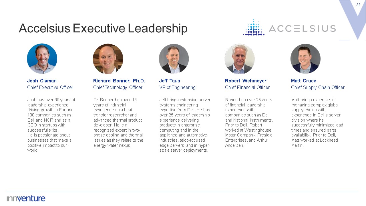 32  Richard Bonner, Ph.D.  Chief Technology Officer  Dr. Bonner has over 18 years of industrial experience as a heat transfer researcher and advanced thermal product developer. He is a recognized expert in two- phase cooling and thermal issues as they relate to the energy-water nexus.  Josh Claman  Chief Executive Officer  Josh has over 30 years of leadership experience driving growth in Fortune 100 companies such as Dell and NCR and as a CEO in startups with successful exits.  He is passionate about businesses that make a positive impact to our world.  Robert Wehmeyer  Chief Financial Officer  Robert has over 25 years of financial leadership experience with companies such as Dell and National Instruments. Prior to Dell, Robert worked at Westinghouse Motor Company, Presidio Enterprises, and Arthur Andersen.  Jeff Taus  VP of Engineering  Jeff brings extensive server systems engineering expertise from Dell. He has over 25 years of leadership experience delivering products in enterprise computing and in the appliance and automotive industries, telco-focused edge servers, and in hyper-scale server deployments.  Accelsius Executive Leadership  Matt Cruce  Chief Supply Chain Officer  Matt brings expertise in managing complex global supply chains with experience in Dell’s server division where he successfully minimized lead times and ensured parts availability. Prior to Dell, Matt worked at Lockheed Martin.