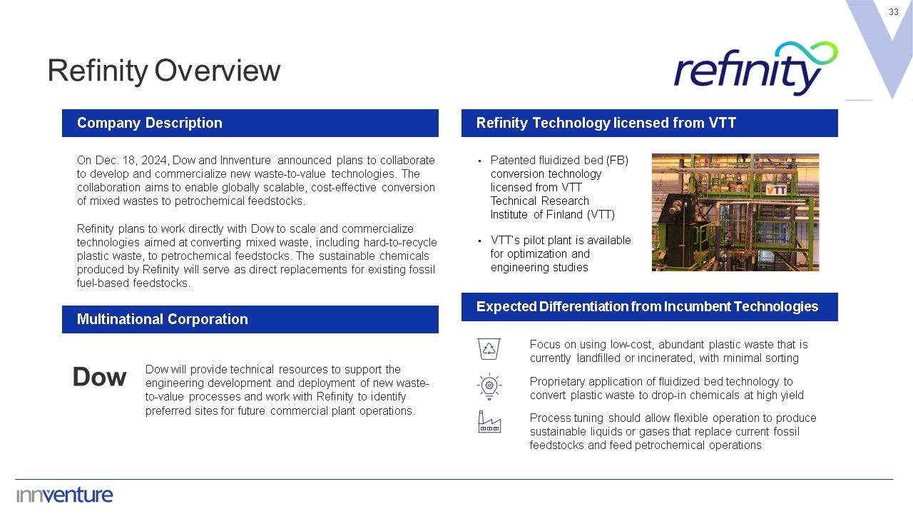 33  Company Description  Refinity Technology licensed from VTT  Expected Differentiation from Incumbent Technologies  Dow  Dow will provide technical resources to support the engineering development and deployment of new waste-to-value processes and work with Refinity to identify preferred sites for future commercial plant operations.  Multinational Corporation  On Dec. 18, 2024, Dow and Innventure announced plans to collaborate to develop and commercialize new waste-to-value technologies. The collaboration aims to enable globally scalable, cost-effective conversion of mixed wastes to petrochemical feedstocks.  Refinity plans to work directly with Dow to scale and commercialize technologies aimed at converting mixed waste, including hard-to-recycle plastic waste, to petrochemical feedstocks. The sustainable chemicals produced by Refinity will serve as direct replacements for existing fossil fuel-based feedstocks.  Patented fluidized bed (FB) conversion technology licensed from VTT Technical Research Institute of Finland (VTT)  VTT’s pilot plant is available for optimization and engineering studies  Focus on using low-cost, abundant plastic waste that is currently landfilled or incinerated, with minimal sorting  Proprietary application of fluidized bed technology to convert plastic waste to drop-in chemicals at high yield  Process tuning should allow flexible operation to produce sustainable liquids or gases that replace current fossil feedstocks and feed petrochemical operations  Refinity Overview