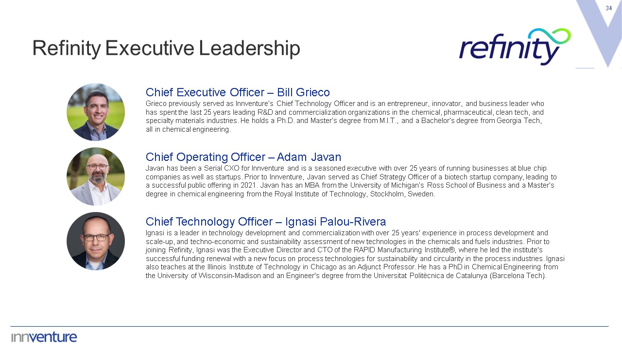 34  Refinity Executive Leadership  Chief Executive Officer – Bill Grieco  Grieco previously served as Innventure’s Chief Technology Officer and is an entrepreneur, innovator, and business leader who has spent the last 25 years leading R&D and commercialization organizations in the chemical, pharmaceutical, clean tech, and specialty materials industries. He holds a Ph.D. and Master’s degree from M.I.T., and a Bachelor’s degree from Georgia Tech, all in chemical engineering.   Chief Operating Officer – Adam Javan  Javan has been a Serial CXO for Innventure and is a seasoned executive with over 25 years of running businesses at blue chip companies as well as startups. Prior to Innventure, Javan served as Chief Strategy Officer of a biotech startup company, leading to a successful public offering in 2021. Javan has an MBA from the University of Michigan’s Ross School of Business and a Master’s degree in chemical engineering from the Royal Institute of Technology, Stockholm, Sweden.  Chief Technology Officer – Ignasi Palou-Rivera  Ignasi is a leader in technology development and commercialization with over 25 years' experience in process development and scale-up, and techno-economic and sustainability assessment of new technologies in the chemicals and fuels industries. Prior to joining Refinity, Ignasi was the Executive Director and CTO of the RAPID Manufacturing Institute®, where he led the institute's successful funding renewal with a new focus on process technologies for sustainability and circularity in the process industries. Ignasi also teaches at the Illinois Institute of Technology in Chicago as an Adjunct Professor. He has a PhD in Chemical Engineering from the University of Wisconsin-Madison and an Engineer's degree from the Universitat Politècnica de Catalunya (Barcelona Tech).