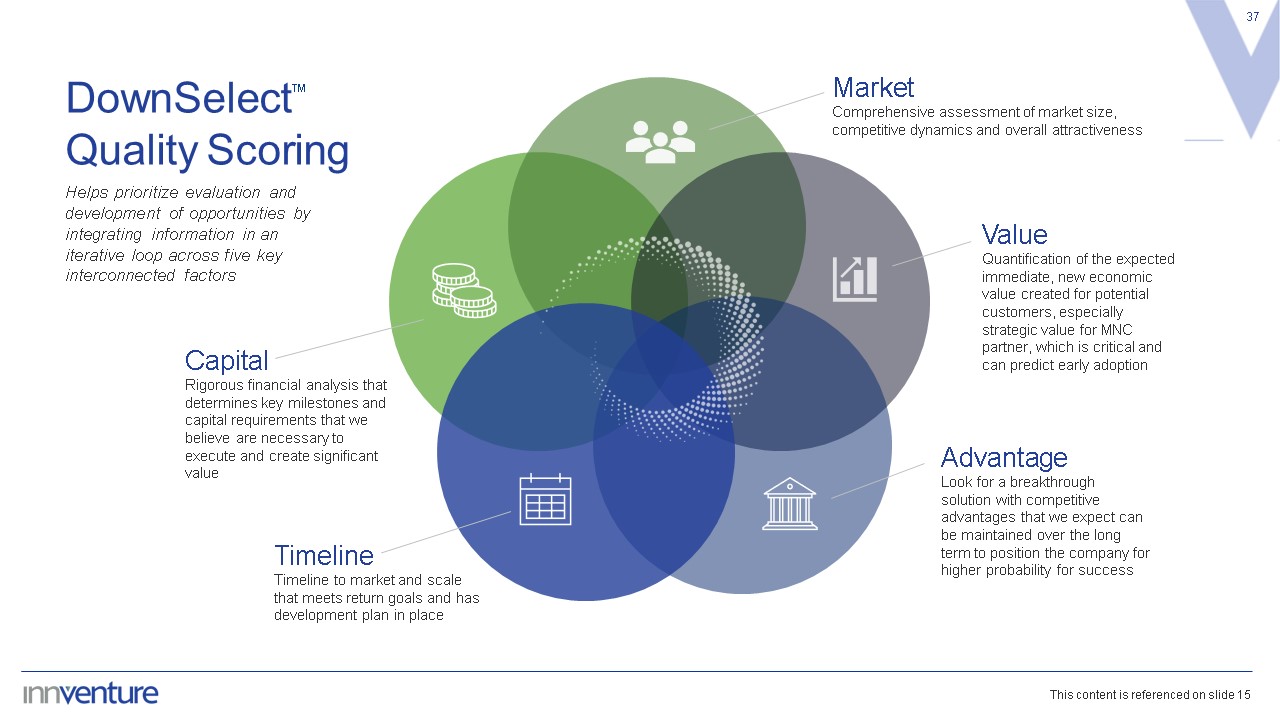 Advantage  Look for a breakthrough solution with competitive advantages that we expect can be maintained over the long term to position the company for higher probability for success  37  DownSelect   Quality Scoring   Helps prioritize evaluation and development of opportunities by integrating information in an iterative loop across five key interconnected factors  Value  Quantification of the expected immediate, new economic value created for potential customers, especially strategic value for MNC partner, which is critical and can predict early adoption   Timeline  Timeline to market and scale that meets return goals and has development plan in place  Capital  Rigorous financial analysis that determines key milestones and capital requirements that we believe are necessary to execute and create significant value  Market  Comprehensive assessment of market size, competitive dynamics and overall attractiveness  ™  This content is referenced on slide 15
