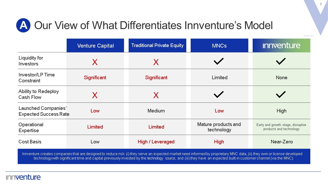 Innventure at a Glance  6  PureCycle Technologies became public in 2021 (Nasdaq “PCT”); Innventure no longer has an economic interest in PCT.  Aggregate enterprise value as of February 2, 2025. Source: FactSet  A  Leveraging market data from MNCs, Innventure identifies technology solutions that present opportunities to launch businesses that we believe have the potential to achieve enterprise values of $1B+  Innventure acquires or licenses technology solutions, funds the commercialization, and launches and scales new “Innventure Companies"  Innventure has an established network of MNCs interested in collaborating with Innventure to monetize new technology solutions  Innventure maintains control as part of a "Disruptive Conglomerate Model"  Four companies launched since Innventure's inception: PureCycle Technologies (Nasdaq: PCT), AeroFlexx, Accelsius, and Refinity  Innventure Company  Technology  New Company #5, #6, …  Technology #5, #6, …  MNC Collaborator  Nokia  2015  Procter & Gamble  (1)  8 Current MNCs showing technologies to be commercialized with aggregate enterprise value of nearly $242 billion(2)  2018  2022  2024  2025+  NASDAQ: PCT  Procter & Gamble  Dow  Thermal Management  Liquids Packaging  Polypropylene Recycling  Waste-to-Value  Recycling  ™  Dow  Innventure founds, funds, and operates companies around transformative, sustainable technology solutions in collaboration with multinational corporations (MNCs), channel partners, or innovation networks.
