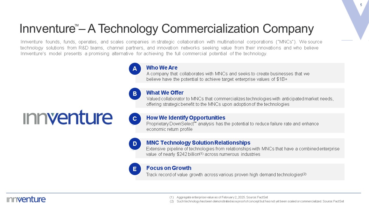 Disclaimer (cont.)  4  Should one or more of these risks or uncertainties materialize, or should any of our assumptions prove incorrect, actual results may vary in material respects from those projected in these forward- looking statements.  All subsequent written and oral forward-looking statements concerning the Company and the Innventure Companies or other matters addressed in this Presentation and attributable to the Company or any person acting on its behalf are expressly qualified in their entirety by the cautionary statements contained or referred to in this Presentation. Except to the extent required by applicable law or regulation, the Company undertakes no obligation to update these forward-looking statements to reflect events or circumstances after the date of this Presentation or to reflect the occurrence of unanticipated events.  Risk Factors  The risks discussed and identified in the public filings made or to be made with the SEC by the Company and those outlined above are certain of the general risks related to the business of the Company and its subsidiaries, and such list is not exhaustive. The occurrence of one or more of the events or circumstances identified as risk factors, alone or in combination with other events or circumstances, may have a material adverse effect on the business, cash flow, financial condition and results of operations of the Company and its subsidiaries. The Company may face additional risks and uncertainties that are not currently known, or that are currently deemed immaterial, which may also impair the Company’s and its subsidiaries business, prospects, financial condition or operating results. Potential investors are encouraged to perform their own investigation with respect to the business, prospects, financial condition and operating results of the Company and its subsidiaries.  Market and Industry Data  Certain market, industry and other data used herein have been obtained or derived from third-party sources and publications as well as from research reports prepared for other purposes. Although the information from these third-party sources is believed to be reliable, none of the Company or its management has independently verified the data obtained from these sources, and no assurances can be made regarding the accuracy or completeness of such data. Forecasts and other forward-looking information obtained from these sources are subject to the same qualifications and the additional uncertainties regarding the other forward-looking statements contained herein.  Trademarks  In addition to trademarks, service marks, trade names, copyrights and logos of Innventure and its subsidiaries contained herein, this presentation contains trademarks, service marks, trade names, copyrights and logos of other companies, which are the property of their respective owners. Unless otherwise stated, the use of these other trademarks, service marks, trade names, copyrights and logos herein does not imply an affiliation with, or endorsement of the information contained herein by, the owners of such trademarks, service marks, trade names, copyrights and logos.