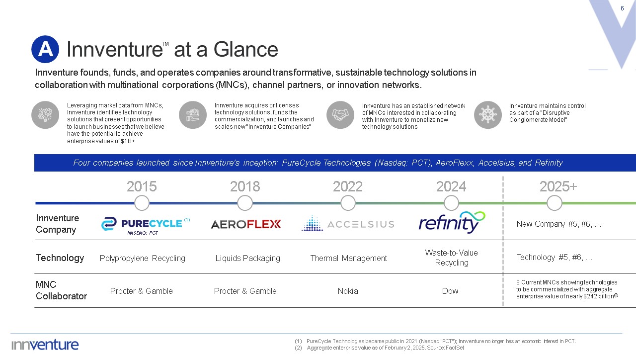 Innventure – A Technology Commercialization Company  5  Aggregate enterprise value as of February 2, 2025. Source: FactSet  Such technology has been demonstrated as a proof of concept but has not yet been scaled or commercialized. Source: FactSet  Who We Are  A company that collaborates with MNCs and seeks to create businesses that we believe have the potential to achieve target enterprise values of $1B+  A  Innventure founds, funds, operates, and scales companies in strategic collaboration with multinational corporations (“MNCs”). We source technology solutions from R&D teams, channel partners, and innovation networks seeking value from their innovations and who believe Innventure's model presents a promising alternative for achieving the full commercial potential of the technology.  What We Offer  Valued collaborator to MNCs that commercializes technologies with anticipated market needs, offering strategic benefit to the MNCs upon adoption of the technologies  B  How We Identify Opportunities  Proprietary DownSelect™ analysis has the potential to reduce failure rate and enhance economic return profile  C  MNC Technology Solution Relationships  Extensive pipeline of technologies from relationships with MNCs that have a combined enterprise value of nearly $242 billion(1) across numerous industries  D  Focus on Growth  Track record of value growth across various proven high demand technologies(2)  E  ™