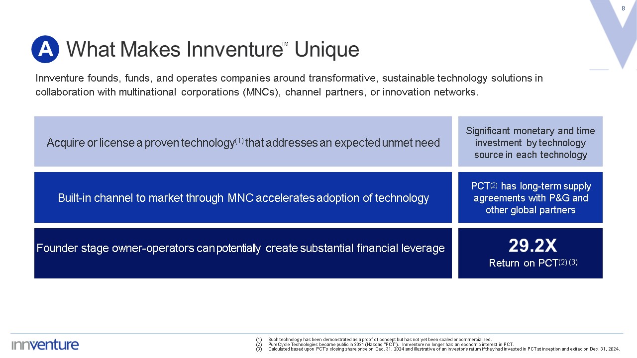 Our View of What Differentiates Innventure’s Model  7  A  Liquidity for Investors  Investor/LP Time Constraint  Ability to Redeploy Cash Flow  Launched Companies’ Expected Success Rate  Operational Expertise  Cost Basis  Innventure creates companies that are designed to reduce risk: (i) they serve an expected market need informed by proprietary MNC data, (ii) they own or license developed technology with significant time and capital previously invested by the technology source, and (iii) they have an expected built-in customer channel (via the MNC)  Venture Capital  Traditional Private Equity  MNCs  X  X  Significant  Significant  Limited  None  X  X  Low  Medium  Low  High  Limited  Limited  Mature products and technology  Early and growth stage, disruptive products and technology  Low  High / Leveraged  High  Near-Zero