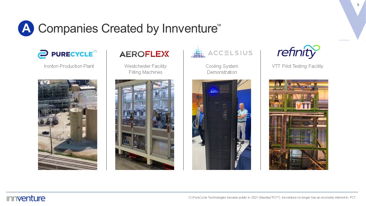 What Makes Innventure Unique  8  A  Innventure founds, funds, and operates companies around transformative, sustainable technology solutions in collaboration with multinational corporations (MNCs), channel partners, or innovation networks.   Acquire or license a proven technology(1) that addresses an expected unmet need  Built-in channel to market through MNC accelerates adoption of technology  Founder stage owner-operators can potentially create substantial financial leverage  Significant monetary and time investment by technology source in each technology  PCT(2) has long-term supply agreements with P&G and other global partners  29.2X  Return on PCT(2) (3)  ™  Such technology has been demonstrated as a proof of concept but has not yet been scaled or commercialized.  PureCycle Technologies became public in 2021 (Nasdaq “PCT”). Innventure no longer has an economic interest in PCT.  Calculated based upon PCT's closing share price on Dec. 31, 2024 and illustrative of an investor's return if they had invested in PCT at inception and exited on Dec. 31, 2024.