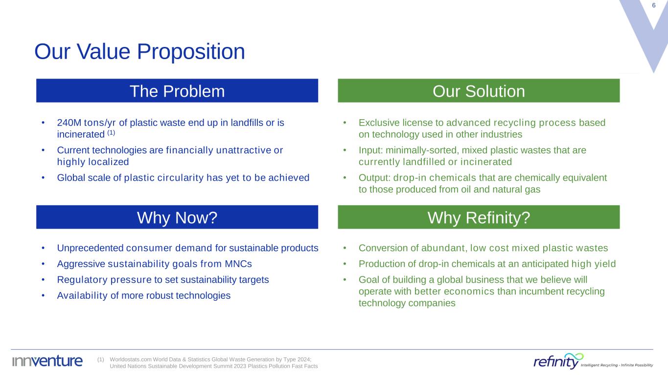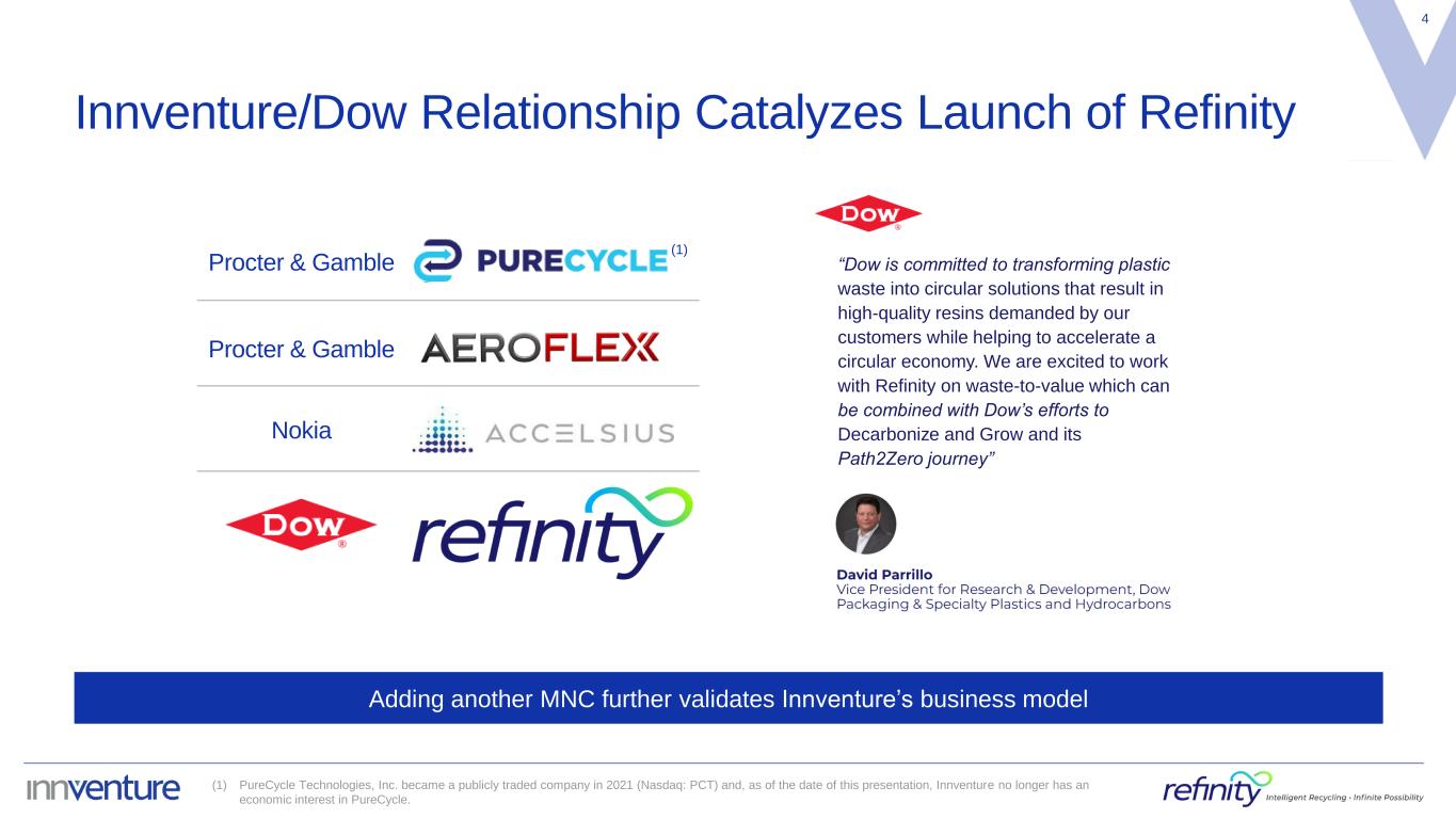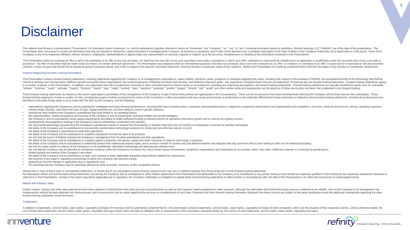 Disclaimer 2 The material that follows is a presentation ("Presentation") of information about Innventure, Inc. and its subsidiaries (together referred to herein as "Innventure," the "Company," "us," "our," or "we"), including information about its subsidiary, Refinity Holdings, LLC (“Refinity”), as of the date of this presentation. The Presentation does not purport to contain all information that may be required or desired by a party interested in investigating the Company, its business or prospects, and it shall not be deemed to be a complete description of the state of affairs of the Company historically, at its stated date or in the future. None of the Company or any of its respective affiliates, officers, directors, employees, representatives or agents make any representation or warranty, express or implied, as to the accuracy, completeness or reliability of the information contained in this Presentation. This Presentation shall not constitute an offer to sell or the solicitation of an offer to buy any securities, nor shall there be any sale of any such securities in any state or jurisdiction in which such offer, solicitation or sale would be unlawful prior to registration or qualification under the securities laws of any such state or jurisdiction. No offer of securities shall be made except by means of a written definitive agreement. This Presentation was prepared solely for informational purposes and does not constitute, and is not to be construed as, an offer, or invitation, or solicitation of an offer, to subscribe for or purchase or sell any securities. Likewise, it does not give and should not be treated as giving investment advice, and it has no regard to the specific investment objectives, financial situation or particular needs of any recipient. Neither this Presentation nor anything contained herein shall form the basis of any contract or commitment whatsoever. Caution Regarding Forward-Looking Information This Presentation contains forward-looking statements, including statements regarding the Company or its management's expectations, hopes, beliefs, intentions, plans, prospects or strategies regarding the future, including with respect to the business of Refinity, the anticipated benefits of the technology that Refinity intends to develop and commercialize, Refinity’s growth and performance expectations, the commercialization of Refinity’s products and services, and Refinity’s long-term goals. Any statements contained herein that are not statements of historical fact are forward-looking statements. Forward-looking statements appear in a number of places in this Presentation. In addition, any statements that refer to projections, forecasts or other characterizations of future events or circumstances, including any underlying assumptions, are forward-looking statements. Forward-looking statements are typically identified by words such as "anticipate," "believe," "continue," "could," "estimate," "expect," "forecast," "intend," "may," "might," "outlook," "plan," "possible," "potential," "predict," "project," "should," "will," "would" and other similar words and expressions, but the absence of these words does not mean that a statement is not forward-looking. These forward-looking statements are based on the current expectations and beliefs of the management of the Company in light of factors they believe are appropriate in the circumstances. There can be no assurance that future developments affecting the Company will be those that we have anticipated. These forward-looking statements involve a number of risks, uncertainties (some of which are beyond the control of the Company) or other assumptions that may cause actual results or performance to be materially different from those expressed or implied by these forward-looking statements, including those discussed and identified in the public filings made or to be made with the SEC by the Company, and the following: • expectations regarding the Company’s and its subsidiaries’ strategies and future financial performance, including their future business plans, expansion and acquisition plans or objectives, prospective performance and opportunities and competitors, revenues, products and services, pricing, operating expenses, market trends, liquidity, cash flows and uses of cash, capital expenditures, and their ability to invest in growth initiatives; • operational risks related to the Company’s subsidiaries that have limited or no operating history; • the implementation, market acceptance and success of the Company’s and its subsidiaries’ business models and growth strategies; • the Company’s and its subsidiaries’ future capital requirements and ability to obtain sufficient funding on attractive terms for operations and future growth and to continue as a going concern; • developments and projections relating to the Company’s and its subsidiaries’ competitors and industry; • the risk that the technology solutions that the Company’s subsidiaries license or acquire from third parties or develop internally may not function as anticipated or provide the benefits anticipated; • the ability of the Company and its subsidiaries to successfully commercialize technology solutions in a timely and cost-effective manner or at all; • the ability of the Company’s subsidiaries to scale their operations; • the ability of the Company and its subsidiaries to establish substantial commercial sales of its products; • the risk that the launch of Refinity distracts the Company’s management from its other subsidiaries and their operations; • the ability of the Company and its subsidiaries to compete against companies with greater capital and other resources or superior technology or products; • the ability of the Company and its subsidiaries to sufficiently protect their intellectual property rights, and to avoid or resolve in a timely and cost-effective manner any disputes that may arise from t