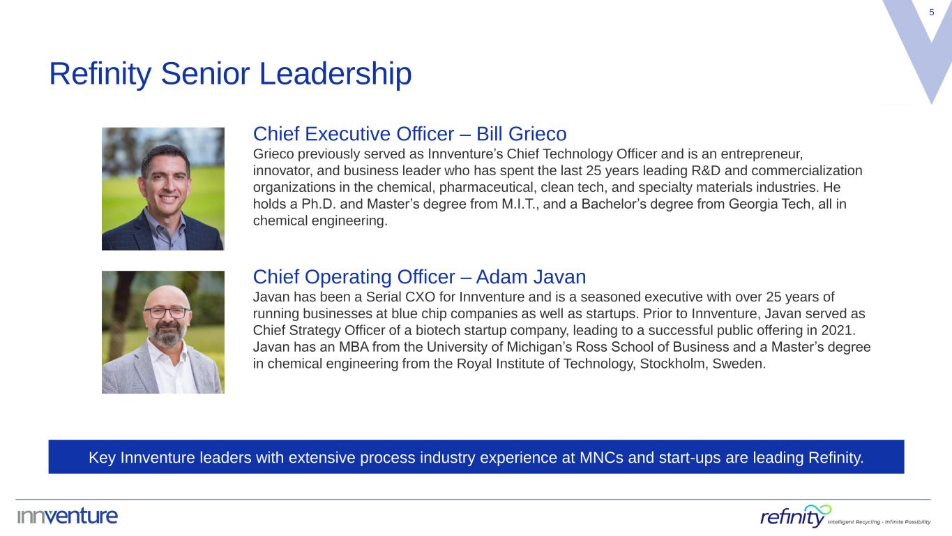 Refinity Senior Leadership 5 Chief Executive Officer – Bill Grieco Grieco previously served as Innventure’s Chief Technology Officer and is an entrepreneur, innovator, and business leader who has spent the last 25 years leading R&D and commercialization organizations in the chemical, pharmaceutical, clean tech, and specialty materials industries. He holds a Ph.D. and Master’s degree from M.I.T., and a Bachelor’s degree from Georgia Tech, all in chemical engineering. Chief Operating Officer – Adam Javan Javan has been a Serial CXO for Innventure and is a seasoned executive with over 25 years of running businesses at blue chip companies as well as startups. Prior to Innventure, Javan served as Chief Strategy Officer of a biotech startup company, leading to a successful public offering in 2021. Javan has an MBA from the University of Michigan’s Ross School of Business and a Master’s degree in chemical engineering from the Royal Institute of Technology, Stockholm, Sweden. Key Innventure leaders with extensive process industry experience at MNCs and start-ups are leading Refinity.
