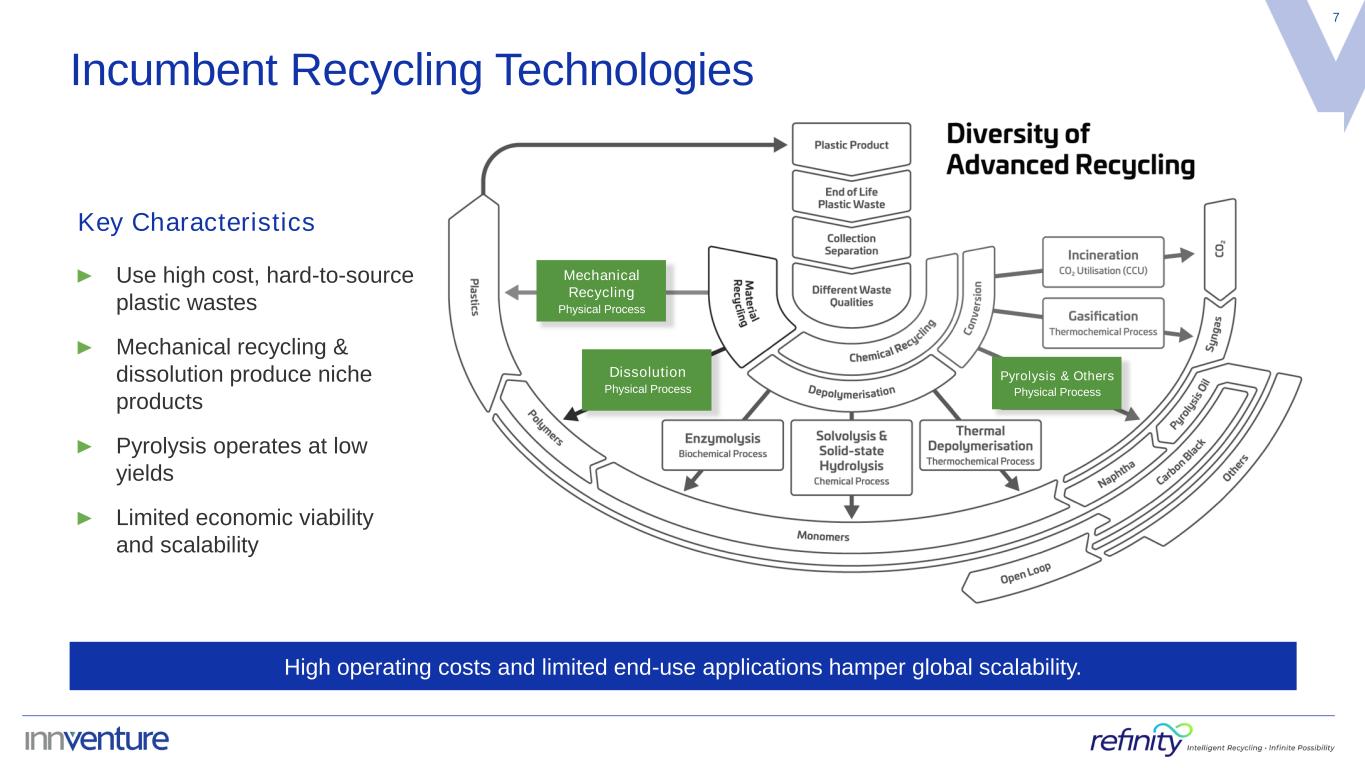 6 Our Value Proposition The Problem Our Solution • 240M tons/yr of plastic waste end up in landfills or is incinerated (1) • Current technologies are financially unattractive or highly localized • Global scale of plastic circularity has yet to be achieved • Exclusive license to advanced recycling process based on technology used in other industries • Input: minimally-sorted, mixed plastic wastes that are currently landfilled or incinerated • Output: drop-in chemicals that are chemically equivalent to those produced from oil and natural gas Why Now? Why Refinity? • Unprecedented consumer demand for sustainable products • Aggressive sustainability goals from MNCs • Regulatory pressure to set sustainability targets • Availability of more robust technologies • Conversion of abundant, low cost mixed plastic wastes • Production of drop-in chemicals at an anticipated high yield • Goal of building a global business that we believe will operate with better economics than incumbent recycling technology companies (1) Worldostats.com World Data & Statistics Global Waste Generation by Type 2024; United Nations Sustainable Development Summit 2023 Plastics Pollution Fast Facts