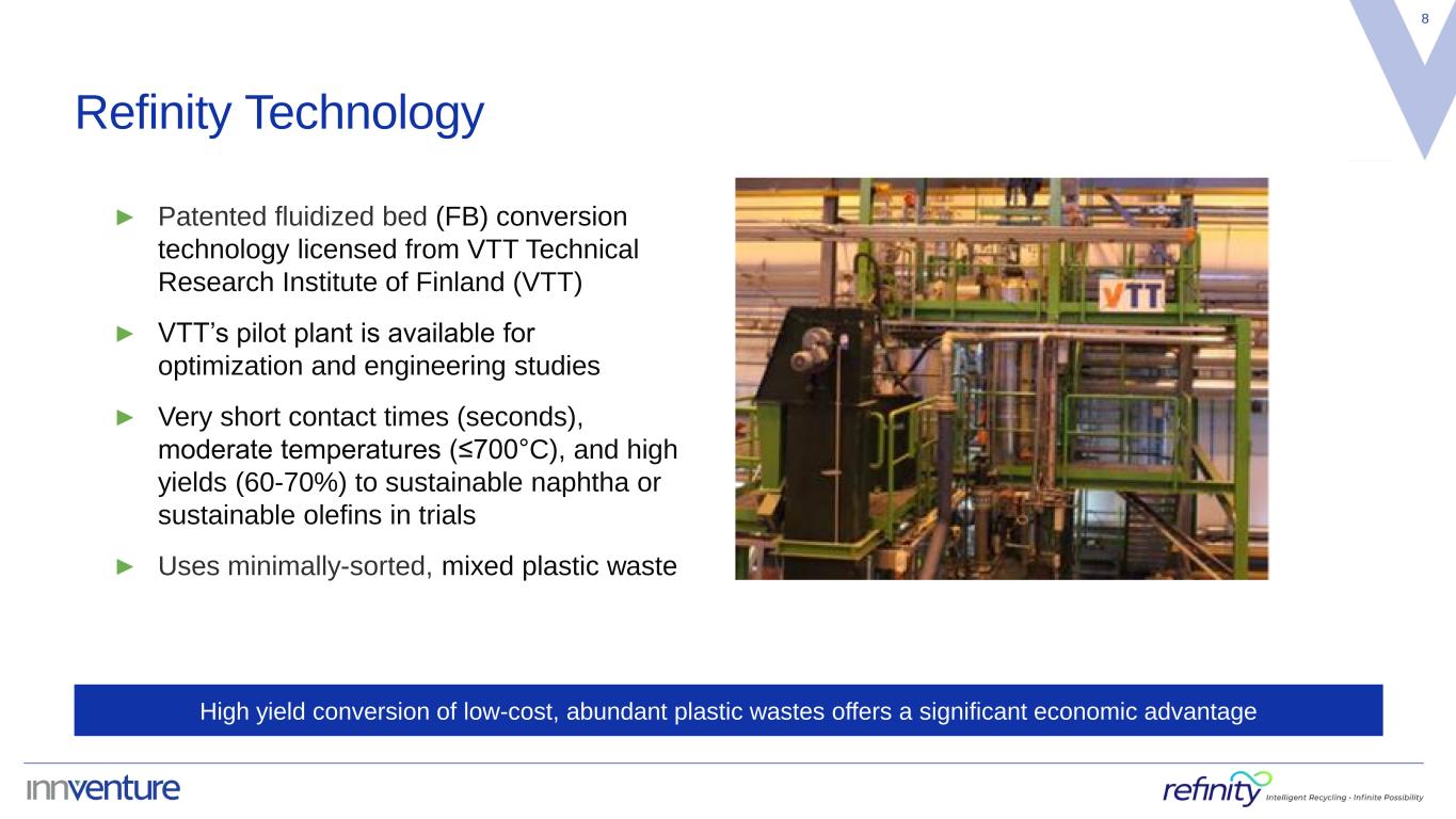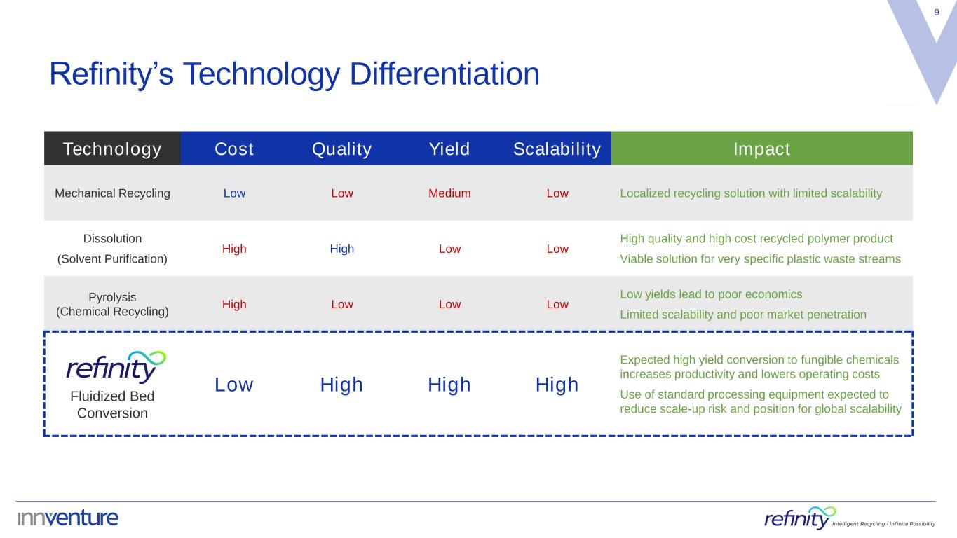 8 Refinity Technology Patented fluidized bed (FB) conversion technology licensed from VTT Technical Research Institute of Finland (VTT) VTT’s pilot plant is available for optimization and engineering studies Very short contact times (seconds), moderate temperatures (≤700°C), and high yields (60-70%) to sustainable naphtha or sustainable olefins in trials Uses minimally-sorted, mixed plastic waste High yield conversion of low-cost, abundant plastic wastes offers a significant economic advantage