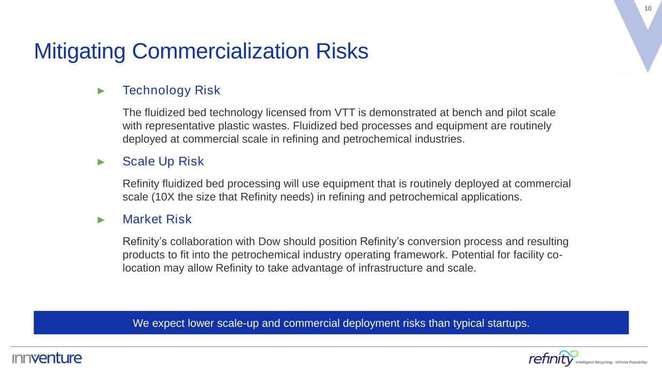 9 Technology Cost Quality Yield Scalability Impact Mechanical Recycling Low Low Medium Low Localized recycling solution with limited scalability Dissolution (Solvent Purification) High High Low Low High quality and high cost recycled polymer product Viable solution for very specific plastic waste streams Pyrolysis (Chemical Recycling) High Low Low Low Low yields lead to poor economics Limited scalability and poor market penetration Fluidized Bed Conversion Low High High High Expected high yield conversion to fungible chemicals increases productivity and lowers operating costs Use of standard processing equipment expected to reduce scale-up risk and position for global scalability Refinity’s Technology Differentiation