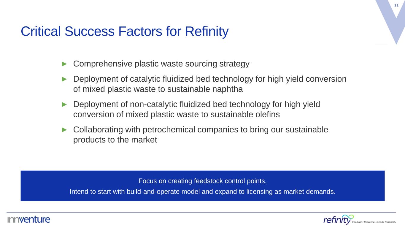 10 Mitigating Commercialization Risks Technology Risk The fluidized bed technology licensed from VTT is demonstrated at bench and pilot scale with representative plastic wastes. Fluidized bed processes and equipment are routinely deployed at commercial scale in refining and petrochemical industries. Scale Up Risk Refinity fluidized bed processing will use equipment that is routinely deployed at commercial scale (10X the size that Refinity needs) in refining and petrochemical applications. Market Risk Refinity’s collaboration with Dow should position Refinity’s conversion process and resulting products to fit into the petrochemical industry operating framework. Potential for facility co- location may allow Refinity to take advantage of infrastructure and scale. We expect lower scale-up and commercial deployment risks than typical startups.