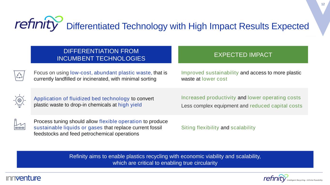 11 Critical Success Factors for Refinity Comprehensive plastic waste sourcing strategy Deployment of catalytic fluidized bed technology for high yield conversion of mixed plastic waste to sustainable naphtha Deployment of non-catalytic fluidized bed technology for high yield conversion of mixed plastic waste to sustainable olefins Collaborating with petrochemical companies to bring our sustainable products to the market Focus on creating feedstock control points. Intend to start with build-and-operate model and expand to licensing as market demands.