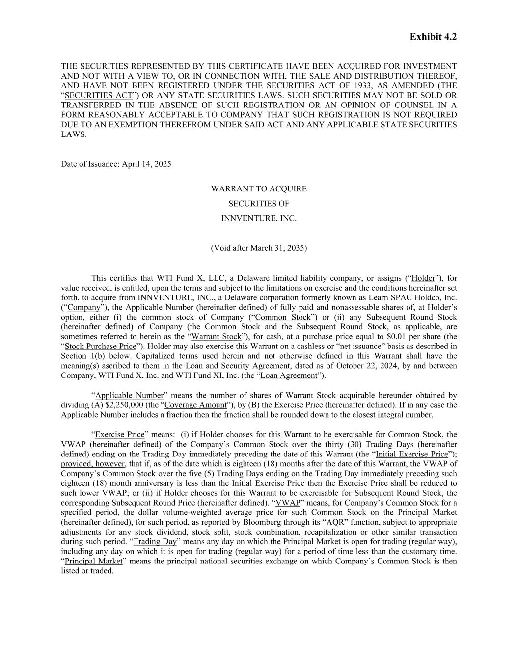 Exhibit 4.2 THE SECURITIES REPRESENTED BY THIS CERTIFICATE HAVE BEEN ACQUIRED FOR INVESTMENT AND NOT WITH A VIEW TO, OR IN CONNECTION WITH, THE SALE AND DISTRIBUTION THEREOF, AND HAVE NOT BEEN REGISTERED UNDER THE SECURITIES ACT OF 1933, AS AMENDED (THE “SECURITIES ACT”) OR ANY STATE SECURITIES LAWS. SUCH SECURITIES MAY NOT BE SOLD OR TRANSFERRED IN THE ABSENCE OF SUCH REGISTRATION OR AN OPINION OF COUNSEL IN A FORM REASONABLY ACCEPTABLE TO COMPANY THAT SUCH REGISTRATION IS NOT REQUIRED DUE TO AN EXEMPTION THEREFROM UNDER SAID ACT AND ANY APPLICABLE STATE SECURITIES LAWS. Date of Issuance: April 14, 2025 WARRANT TO ACQUIRE SECURITIES OF INNVENTURE, INC. (Void after March 31, 2035) This certifies that WTI Fund X, LLC, a Delaware limited liability company, or assigns (“Holder”), for value received, is entitled, upon the terms and subject to the limitations on exercise and the conditions hereinafter set forth, to acquire from INNVENTURE, INC., a Delaware corporation formerly known as Learn SPAC Holdco, Inc. (“Company”), the Applicable Number (hereinafter defined) of fully paid and nonassessable shares of, at Holder’s option, either (i) the common stock of Company (“Common Stock”) or (ii) any Subsequent Round Stock (hereinafter defined) of Company (the Common Stock and the Subsequent Round Stock, as applicable, are sometimes referred to herein as the “Warrant Stock”), for cash, at a purchase price equal to $0.01 per share (the “Stock Purchase Price”). Holder may also exercise this Warrant on a cashless or “net issuance” basis as described in Section 1(b) below. Capitalized terms used herein and not otherwise defined in this Warrant shall have the meaning(s) ascribed to them in the Loan and Security Agreement, dated as of October 22, 2024, by and between Company, WTI Fund X, Inc. and WTI Fund XI, Inc. (the “Loan Agreement”). “Applicable Number” means the number of shares of Warrant Stock acquirable hereunder obtained by dividing (A) $2,250,000 (the “Coverage Amount”), by (B) the Exercise Price (hereinafter defined). If in any case the Applicable Number includes a fraction then the fraction shall be rounded down to the closest integral number. “Exercise Price” means: (i) if Holder chooses for this Warrant to be exercisable for Common Stock, the VWAP (hereinafter defined) of the Company’s Common Stock over the thirty (30) Trading Days (hereinafter defined) ending on the Trading Day immediately preceding the date of this Warrant (the “Initial Exercise Price”); provided, however, that if, as of the date which is eighteen (18) months after the date of this Warrant, the VWAP of Company’s Common Stock over the five (5) Trading Days ending on the Trading Day immediately preceding such eighteen (18) month anniversary is less than the Initial Exercise Price then the Exercise Price shall be reduced to such lower VWAP; or (ii) if Holder chooses for this Warrant to be exercisable for Subsequent Round Stock, the corresponding Subsequent Round Price (hereinafter defined). “VWAP” means, for Company’s Common Stock for a specified period, the dollar volume-weighted average price for such Common Stock on the Principal Market (hereinafter defined), for such period, as reported by Bloomberg through its “AQR” function, subject to appropriate adjustments for any stock dividend, stock split, stock combination, recapitalization or other similar transaction during such period. “Trading Day” means any day on which the Principal Market is open for trading (regular way), including any day on which it is open for trading (regular way) for a period of time less than the customary time. “Principal Market” means the principal national securities exchange on which Company’s Common Stock is then listed or traded.