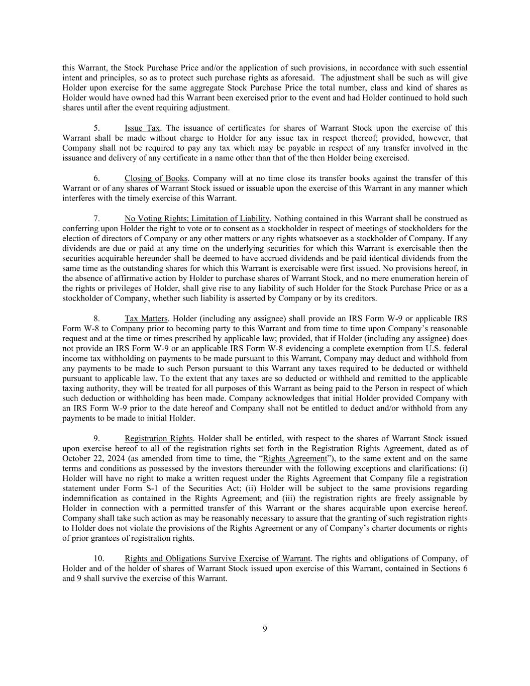 9 this Warrant, the Stock Purchase Price and/or the application of such provisions, in accordance with such essential intent and principles, so as to protect such purchase rights as aforesaid. The adjustment shall be such as will give Holder upon exercise for the same aggregate Stock Purchase Price the total number, class and kind of shares as Holder would have owned had this Warrant been exercised prior to the event and had Holder continued to hold such shares until after the event requiring adjustment. 5. Issue Tax. The issuance of certificates for shares of Warrant Stock upon the exercise of this Warrant shall be made without charge to Holder for any issue tax in respect thereof; provided, however, that Company shall not be required to pay any tax which may be payable in respect of any transfer involved in the issuance and delivery of any certificate in a name other than that of the then Holder being exercised. 6. Closing of Books. Company will at no time close its transfer books against the transfer of this Warrant or of any shares of Warrant Stock issued or issuable upon the exercise of this Warrant in any manner which interferes with the timely exercise of this Warrant. 7. No Voting Rights; Limitation of Liability. Nothing contained in this Warrant shall be construed as conferring upon Holder the right to vote or to consent as a stockholder in respect of meetings of stockholders for the election of directors of Company or any other matters or any rights whatsoever as a stockholder of Company. If any dividends are due or paid at any time on the underlying securities for which this Warrant is exercisable then the securities acquirable hereunder shall be deemed to have accrued dividends and be paid identical dividends from the same time as the outstanding shares for which this Warrant is exercisable were first issued. No provisions hereof, in the absence of affirmative action by Holder to purchase shares of Warrant Stock, and no mere enumeration herein of the rights or privileges of Holder, shall give rise to any liability of such Holder for the Stock Purchase Price or as a stockholder of Company, whether such liability is asserted by Company or by its creditors. 8. Tax Matters. Holder (including any assignee) shall provide an IRS Form W-9 or applicable IRS Form W-8 to Company prior to becoming party to this Warrant and from time to time upon Company’s reasonable request and at the time or times prescribed by applicable law; provided, that if Holder (including any assignee) does not provide an IRS Form W-9 or an applicable IRS Form W-8 evidencing a complete exemption from U.S. federal income tax withholding on payments to be made pursuant to this Warrant, Company may deduct and withhold from any payments to be made to such Person pursuant to this Warrant any taxes required to be deducted or withheld pursuant to applicable law. To the extent that any taxes are so deducted or withheld and remitted to the applicable taxing authority, they will be treated for all purposes of this Warrant as being paid to the Person in respect of which such deduction or withholding has been made. Company acknowledges that initial Holder provided Company with an IRS Form W-9 prior to the date hereof and Company shall not be entitled to deduct and/or withhold from any payments to be made to initial Holder. 9. Registration Rights. Holder shall be entitled, with respect to the shares of Warrant Stock issued upon exercise hereof to all of the registration rights set forth in the Registration Rights Agreement, dated as of October 22, 2024 (as amended from time to time, the “Rights Agreement”), to the same extent and on the same terms and conditions as possessed by the investors thereunder with the following exceptions and clarifications: (i) Holder will have no right to make a written request under the Rights Agreement that Company file a registration statement under Form S-1 of the Securities Act; (ii) Holder will be subject to the same provisions regarding indemnification as contained in the Rights Agreement; and (iii) the registration rights are freely assignable by Holder in connection with a permitted transfer of this Warrant or the shares acquirable upon exercise hereof. Company shall take such action as may be reasonably necessary to assure that the granting of such registration rights to Holder does not violate the provisions of the Rights Agreement or any of Company’s charter documents or rights of prior grantees of registration rights. 10. Rights and Obligations Survive Exercise of Warrant. The rights and obligations of Company, of Holder and of the holder of shares of Warrant Stock issued upon exercise of this Warrant, contained in Sections 6 and 9 shall survive the exercise of this Warrant.