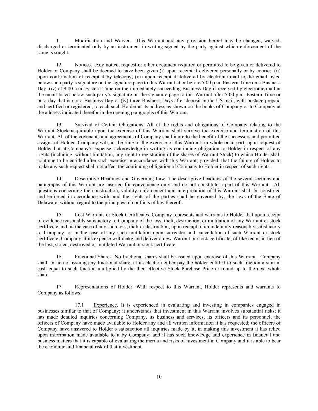 10 11. Modification and Waiver. This Warrant and any provision hereof may be changed, waived, discharged or terminated only by an instrument in writing signed by the party against which enforcement of the same is sought. 12. Notices. Any notice, request or other document required or permitted to be given or delivered to Holder or Company shall be deemed to have been given (i) upon receipt if delivered personally or by courier, (ii) upon confirmation of receipt if by telecopy, (iii) upon receipt if delivered by electronic mail to the email listed below such party’s signature on the signature page to this Warrant at or before 5:00 p.m. Eastern Time on a Business Day, (iv) at 9:00 a.m. Eastern Time on the immediately succeeding Business Day if received by electronic mail at the email listed below such party’s signature on the signature page to this Warrant after 5:00 p.m. Eastern Time or on a day that is not a Business Day or (iv) three Business Days after deposit in the US mail, with postage prepaid and certified or registered, to each such Holder at its address as shown on the books of Company or to Company at the address indicated therefor in the opening paragraphs of this Warrant. 13. Survival of Certain Obligations. All of the rights and obligations of Company relating to the Warrant Stock acquirable upon the exercise of this Warrant shall survive the exercise and termination of this Warrant. All of the covenants and agreements of Company shall inure to the benefit of the successors and permitted assigns of Holder. Company will, at the time of the exercise of this Warrant, in whole or in part, upon request of Holder but at Company’s expense, acknowledge in writing its continuing obligation to Holder in respect of any rights (including, without limitation, any right to registration of the shares of Warrant Stock) to which Holder shall continue to be entitled after such exercise in accordance with this Warrant; provided, that the failure of Holder to make any such request shall not affect the continuing obligation of Company to Holder in respect of such rights. 14. Descriptive Headings and Governing Law. The descriptive headings of the several sections and paragraphs of this Warrant are inserted for convenience only and do not constitute a part of this Warrant. All questions concerning the construction, validity, enforcement and interpretation of this Warrant shall be construed and enforced in accordance with, and the rights of the parties shall be governed by, the laws of the State of Delaware, without regard to the principles of conflicts of law thereof.. 15. Lost Warrants or Stock Certificates. Company represents and warrants to Holder that upon receipt of evidence reasonably satisfactory to Company of the loss, theft, destruction, or mutilation of any Warrant or stock certificate and, in the case of any such loss, theft or destruction, upon receipt of an indemnity reasonably satisfactory to Company, or in the case of any such mutilation upon surrender and cancellation of such Warrant or stock certificate, Company at its expense will make and deliver a new Warrant or stock certificate, of like tenor, in lieu of the lost, stolen, destroyed or mutilated Warrant or stock certificate. 16. Fractional Shares. No fractional shares shall be issued upon exercise of this Warrant. Company shall, in lieu of issuing any fractional share, at its election either pay the holder entitled to such fraction a sum in cash equal to such fraction multiplied by the then effective Stock Purchase Price or round up to the next whole share. 17. Representations of Holder. With respect to this Warrant, Holder represents and warrants to Company as follows: 17.1 Experience. It is experienced in evaluating and investing in companies engaged in businesses similar to that of Company; it understands that investment in this Warrant involves substantial risks; it has made detailed inquiries concerning Company, its business and services, its officers and its personnel; the officers of Company have made available to Holder any and all written information it has requested; the officers of Company have answered to Holder’s satisfaction all inquiries made by it; in making this investment it has relied upon information made available to it by Company; and it has such knowledge and experience in financial and business matters that it is capable of evaluating the merits and risks of investment in Company and it is able to bear the economic and financial risk of that investment.