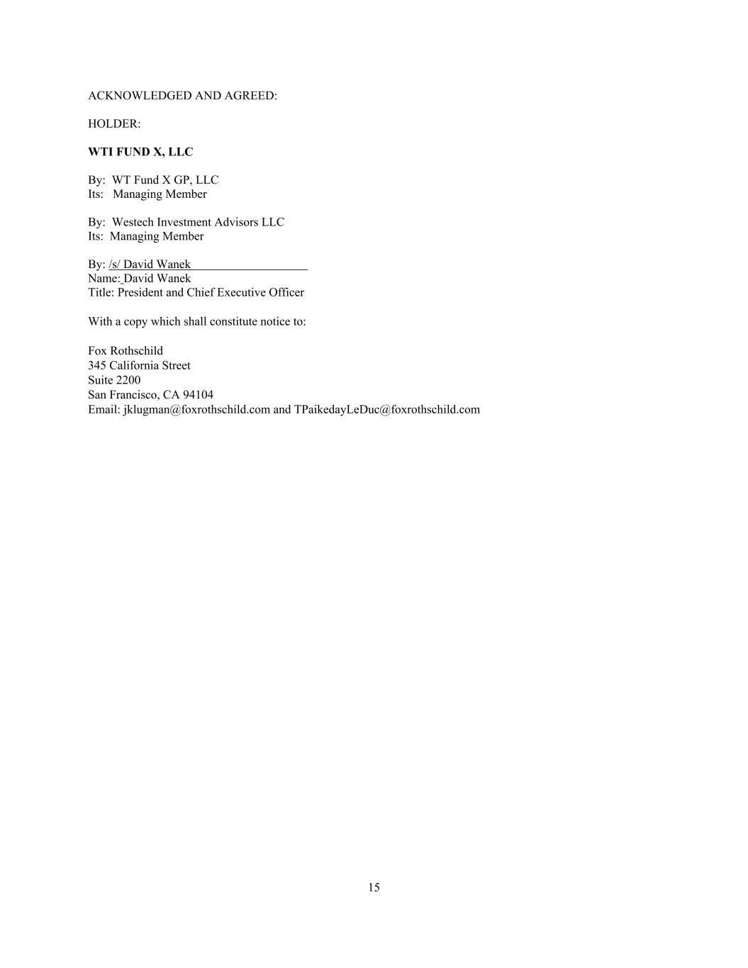 15 ACKNOWLEDGED AND AGREED: HOLDER: WTI FUND X, LLC By: WT Fund X GP, LLC Its: Managing Member By: Westech Investment Advisors LLC Its: Managing Member By: /s/ David Wanek Name: David Wanek Title: President and Chief Executive Officer With a copy which shall constitute notice to: Fox Rothschild 345 California Street Suite 2200 San Francisco, CA 94104 Email: jklugman@foxrothschild.com and TPaikedayLeDuc@foxrothschild.com