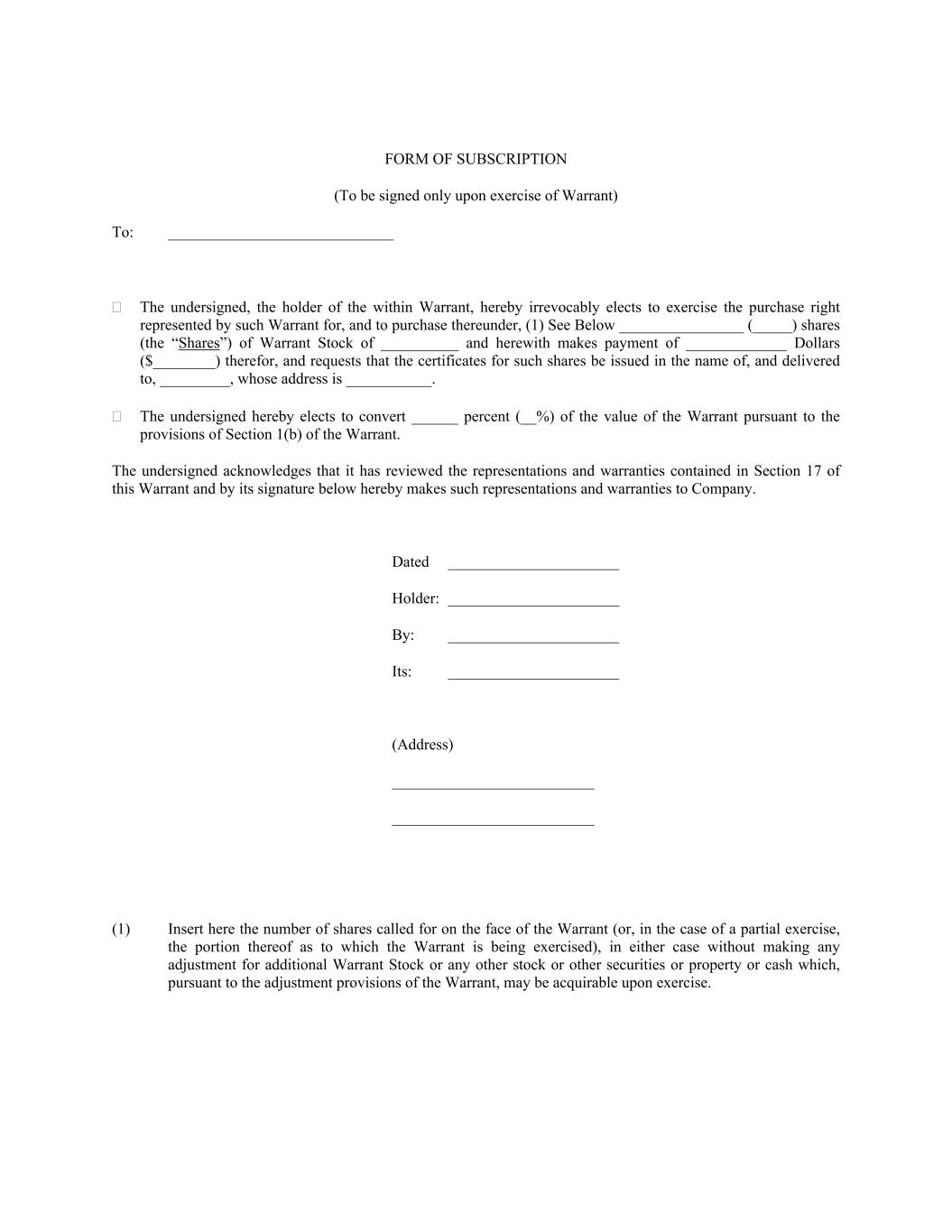 FORM OF SUBSCRIPTION (To be signed only upon exercise of Warrant) To: _____________________________ ￿ The undersigned, the holder of the within Warrant, hereby irrevocably elects to exercise the purchase right represented by such Warrant for, and to purchase thereunder, (1) See Below ________________ (_____) shares (the “Shares”) of Warrant Stock of __________ and herewith makes payment of _____________ Dollars ($________) therefor, and requests that the certificates for such shares be issued in the name of, and delivered to, _________, whose address is ___________. ￿ The undersigned hereby elects to convert ______ percent (__%) of the value of the Warrant pursuant to the provisions of Section 1(b) of the Warrant. The undersigned acknowledges that it has reviewed the representations and warranties contained in Section 17 of this Warrant and by its signature below hereby makes such representations and warranties to Company. Dated ______________________ Holder: ______________________ By: ______________________ Its: ______________________ (Address) __________________________ __________________________ (1) Insert here the number of shares called for on the face of the Warrant (or, in the case of a partial exercise, the portion thereof as to which the Warrant is being exercised), in either case without making any adjustment for additional Warrant Stock or any other stock or other securities or property or cash which, pursuant to the adjustment provisions of the Warrant, may be acquirable upon exercise.